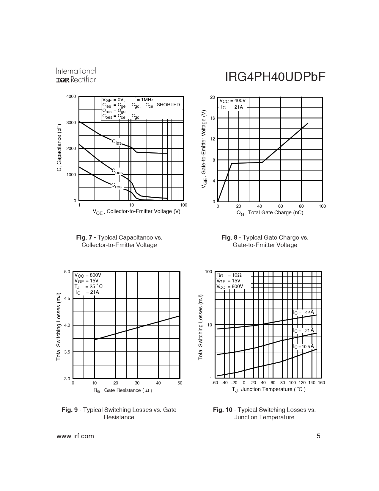 - Typical Gate Charge vs. Collector-to-Emitter Voltage Gate-to-Emitter Voltage 5.0 100 V = 800V CC G 10Ω V = 15V GE R = Ohm V = 15V GE T = 25 C ° J V = 800V CC I = 21A C 4.5 I = A C 42 4.0 10 I = A C 21 I = A C 10.5 3.5 Total Switching Losses (mJ) Total Switching Losses (mJ) 3.0 1 0 10 20 30 40 50 -60 -40 -20 0 20 40 60 80 100 120 140 160 R , Gate Resistance (Ohm) G R T , Junction Temperature ( C ) G , Gate Resistance ( Ω ) J °