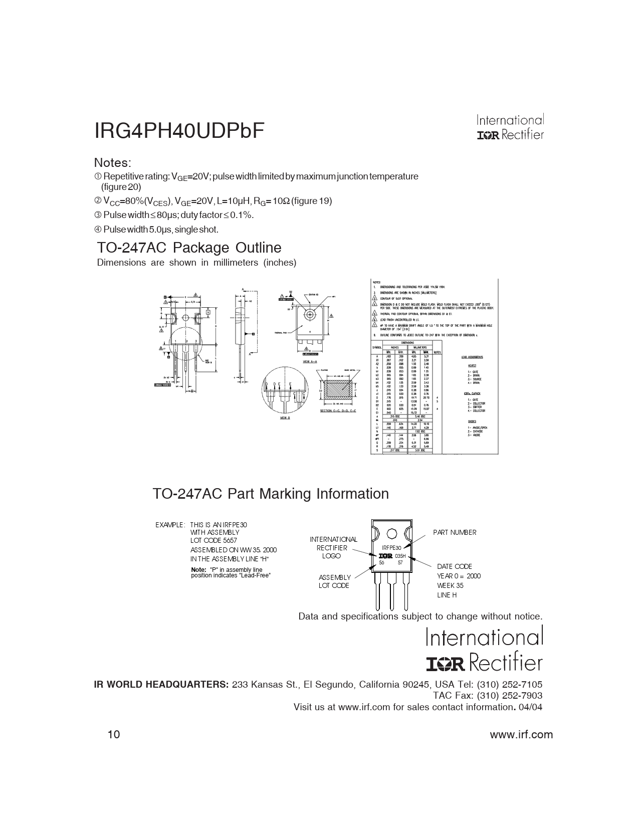 IRG4PH40UDPbF Notes: Q Repetitive rating: VGE=20V; pulse width limited by maximum junction temperature (figure 20) R VCC=80%(VCES), VGE=20V, L=10µH, RG= 10Ω (figure 19) S Pulse width ≤ 80µs; duty factor ≤ 0.1%. T Pulse width 5.0µs, single shot. TO-247AC Package Outline Dimensions are shown in millimeters (inches) TO-247AC Part Marking Information EXAMPLE: THIS IS AN IRFPE30 WITH ASSEMBLY PART NUMBER LOT CODE 5657 INTERNATIONAL ASSEMBLED ON WW 35, 2000 RECTIFIER IRFPE30 IN THE ASSEMBLY LINE "H" LOGO 035H 56 57 DATE CODE