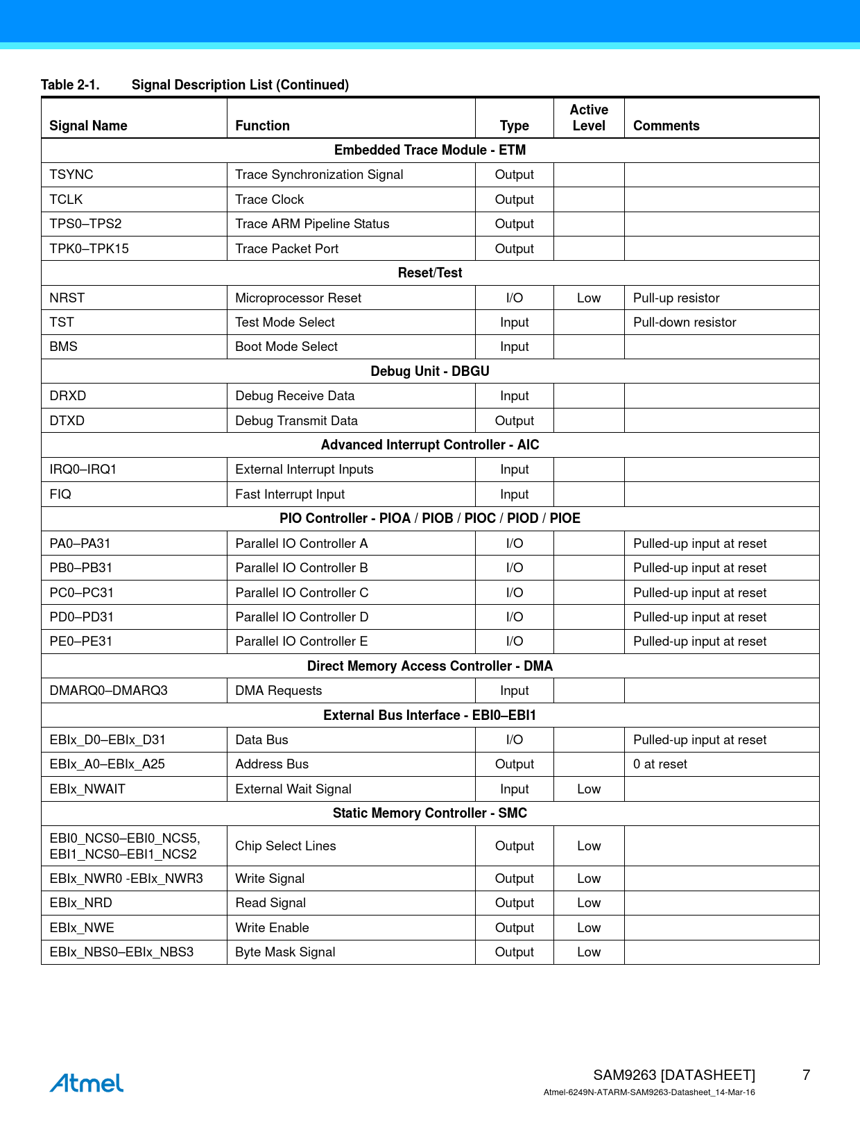 PA0–PA31 Parallel IO Controller A I/O Pulled-up input at reset PB0–PB31 Parallel IO Controller B I/O Pulled-up input at reset PC0–PC31 Parallel IO Controller C I/O Pulled-up input at reset PD0–PD31 Parallel IO Controller D I/O Pulled-up input at reset PE0–PE31 Parallel IO Controller E I/O Pulled-up input at reset