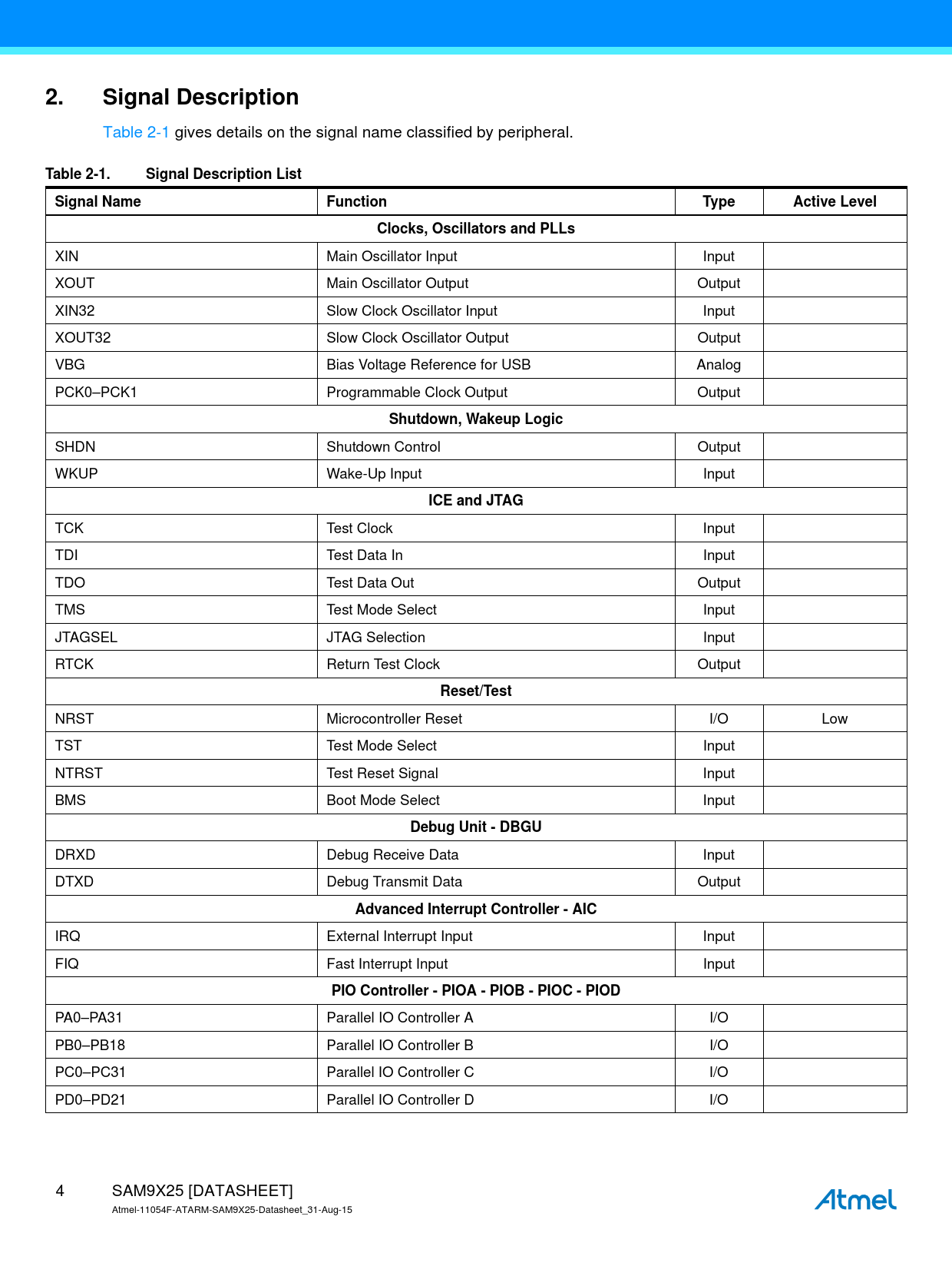 Signal Description. Table 2-1. Signal Description List. Signal Name. Function. Type. Active Level. Clocks, Oscillators and PLLs
