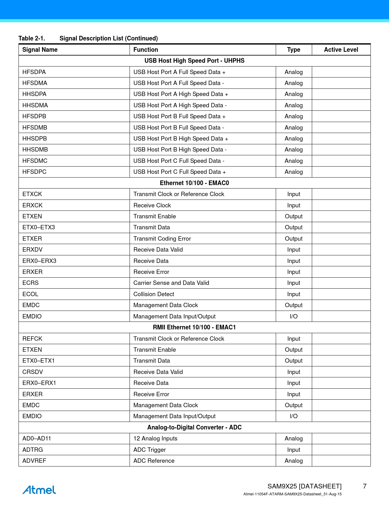 Table 2-1. Signal Description List (Continued). Signal Name. Function. Type. Active Level. USB Host High Speed Port - UHPHS