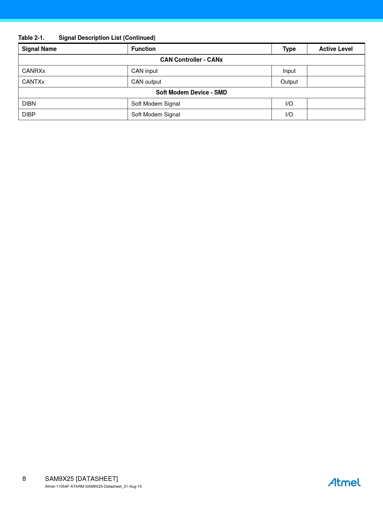 Table 2-1. Signal Description List (Continued) Signal Name Function Type Active Level CAN Controller - CANx