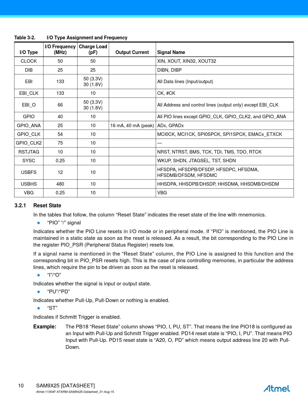 In the tables that follow, the column “Reset State” indicates the reset state of the line with mnemonics. “PIO” “/” signal Indicates whether the PIO Line resets in I/O mode or in peripheral mode. If “PIO” is mentioned, the PIO Line is maintained in a static state as soon as the reset is released. As a result, the bit corresponding to the PIO Line in the register PIO_PSR (Peripheral Status Register) resets low. If a signal name is mentioned in the “Reset State” column, the PIO Line is assigned to this function and the corresponding bit in PIO_PSR resets high. This is the case of pins controlling memories, in particular the address lines, which require the pin to be driven as soon as the reset is released. “I”/“O” Indicates whether the signal is input or output state. “PU”/“PD” Indicates whether Pull-Up, Pull-Down or nothing is enabled. “ST” Indicates if Schmitt Trigger is enabled.