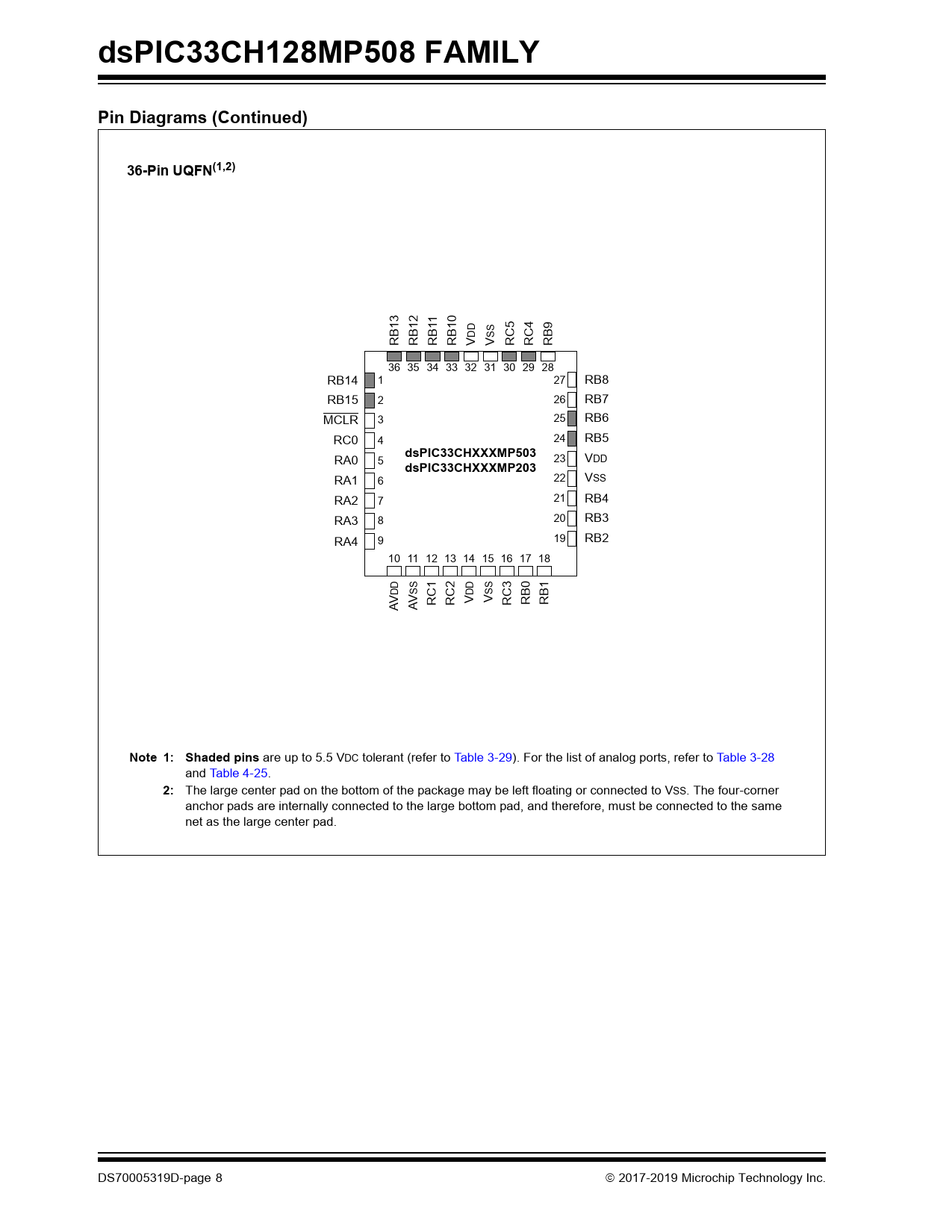 dsPIC33CH128MP508 FAMILY. Pin Diagrams (Continued). 36-Pin UQFN(1,2). dsPIC33CHXXXMP503. dsPIC33CHXXXMP203. Note 1: Shaded pins