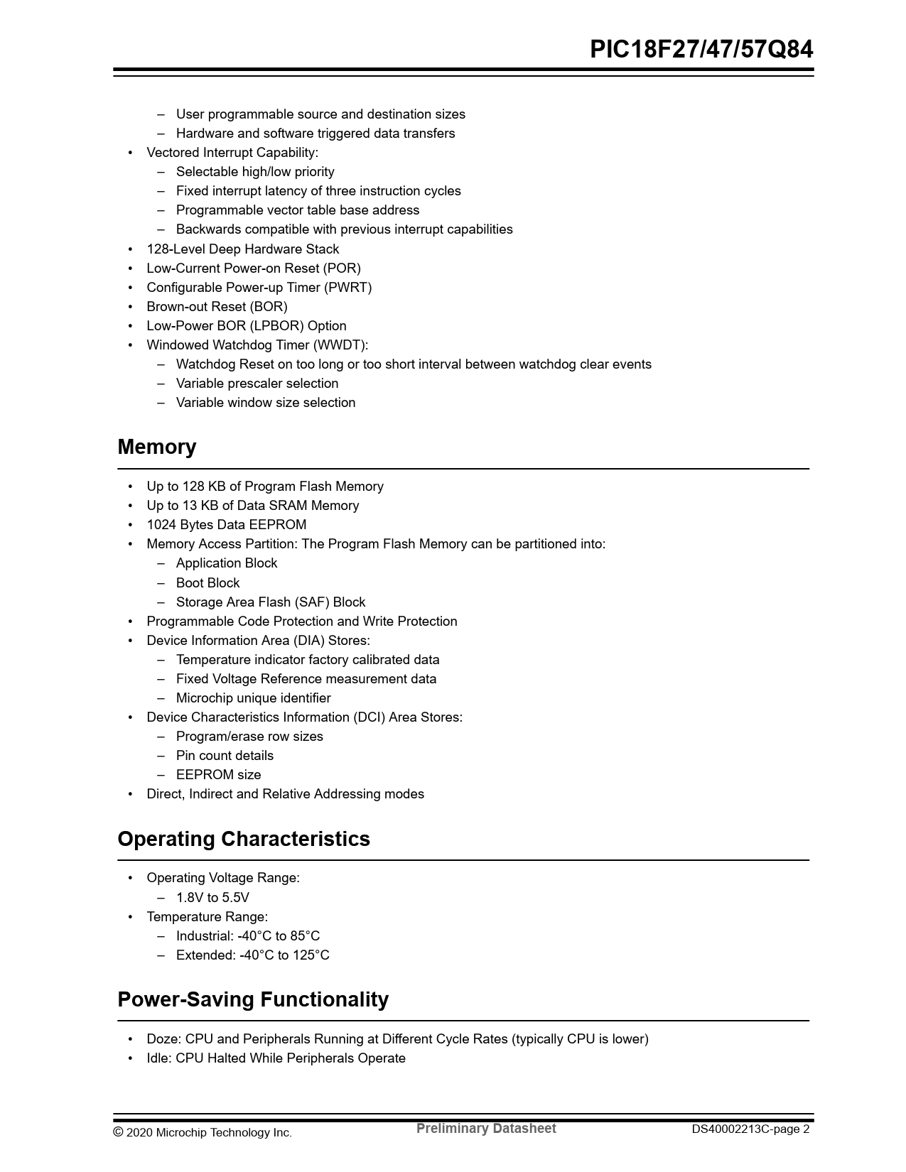 PIC18F27/47/57Q84. Memory. Operating Characteristics. Power-Saving Functionality. Preliminary Datasheet