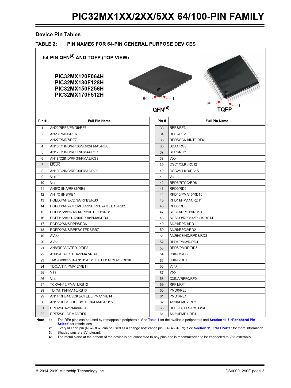 PIC32MX1XX/2XX/5XX 64/100-PIN FAMILY Device Pin Tables TABLE 2: PIN NAMES FOR 64-PIN GENERAL PURPOSE DEVICES 64-PIN QFN(4) AND TQFP (TOP VIEW) PIC32MX120F064H PIC32MX130F128H PIC32MX150F256H PIC32MX170F512H