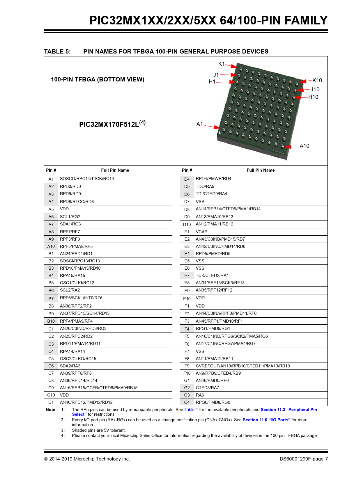 PIC32MX1XX/2XX/5XX 64/100-PIN FAMILY TABLE 5: PIN NAMES FOR TFBGA 100-PIN GENERAL PURPOSE DEVICES