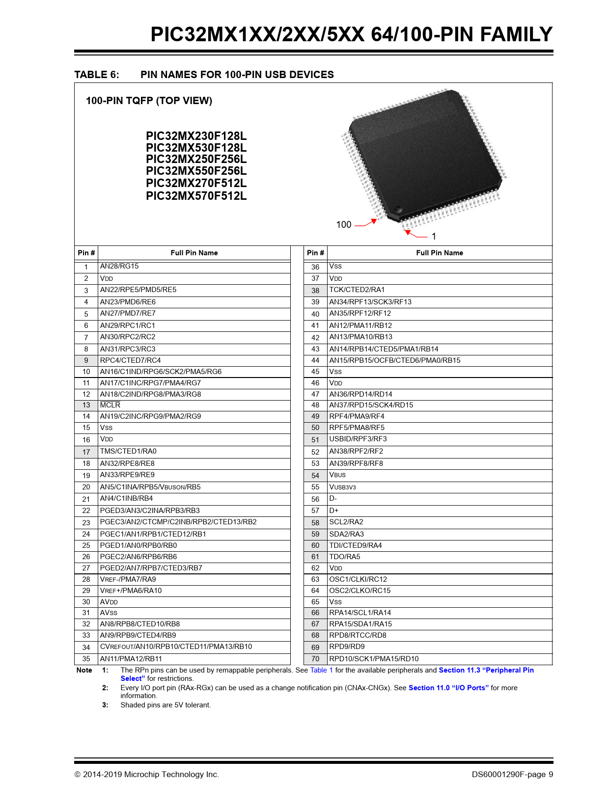 PIC32MX1XX/2XX/5XX 64/100-PIN FAMILY. TABLE 6:. PIN NAMES FOR 100-PIN USB DEVICES. 100-PIN TQFP (TOP VIEW). PIC32MX230F128L