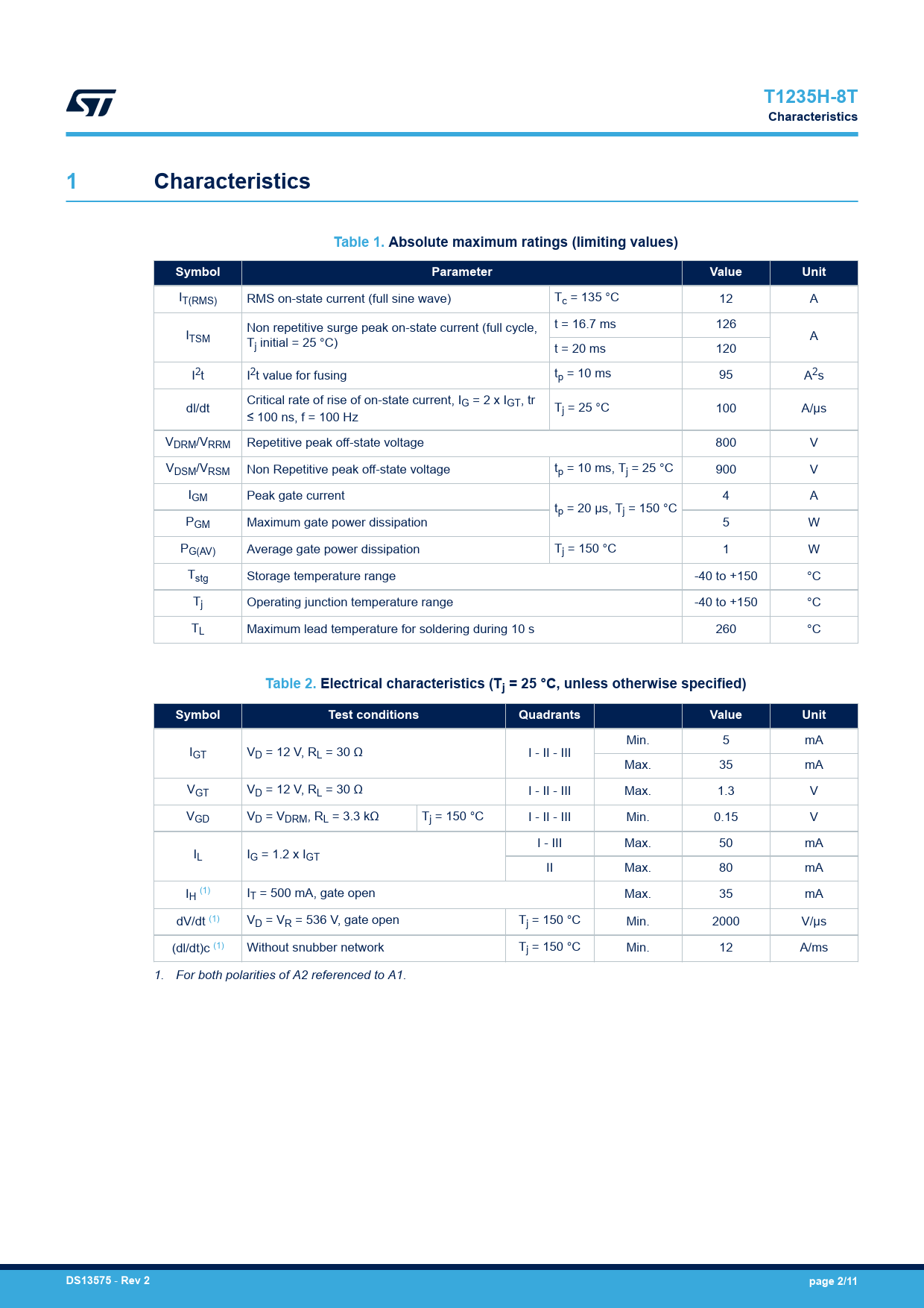 link to page 2 link to page 2 link to page 2 T1235H-8TCharacteristics1CharacteristicsTable 1. Absolute maximum ratings (limiting values)SymbolParameterValueUnit IT(RMS) RMS on-state current (full sine wave) Tc = 135 °C 12 A Non repetitive surge peak on-state current (full cycle, t = 16.7 ms 126 ITSM T A j initial = 25 °C) t = 20 ms 120 I2t I2t value for fusing tp = 10 ms 95 A2s Critical rate of rise of on-state current, I dl/dt G = 2 x IGT, tr T ≤ 100 ns, f = 100 Hz j = 25 °C 100 A/µs VDRM/VRRM Repetitive peak off-state voltage 800 V VDSM/VRSM Non Repetitive peak off-state voltage tp = 10 ms, Tj = 25 °C 900 V IGM Peak gate current 4 A tp = 20 µs, Tj = 150 °C PGM Maximum gate power dissipation 5 W PG(AV) Average gate power dissipation Tj = 150 °C 1 W Tstg Storage temperature range -40 to +150 °C Tj Operating junction temperature range -40 to +150 °C TL Maximum lead temperature for soldering during 10 s 260 °C Table 2. Electrical characteristics (Tj = 25 °C, unless otherwise specified)SymbolTest conditionsQuadrantsValueUnit Min. 5 mA IGT VD = 12 V, RL = 30 Ω I - II - III Max. 35 mA VGT VD = 12 V, RL = 30 Ω I - II - III Max. 1.3 V VGD VD = VDRM, RL = 3.3 kΩ Tj = 150 °C I - II - III Min. 0.15 V I - III Max. 50 mA IL IG = 1.2 x IGT II Max. 80 mA IH (1) IT = 500 mA, gate open Max. 35 mA dV/dt (1) VD = VR = 536 V, gate open Tj = 150 °C Min. 2000 V/µs (dl/dt)c (1) Without snubber network Tj = 150 °C Min. 12 A/ms 1. For both polarities of A2 referenced to A1. DS13575 - Rev 2page 2/11 Document Outline 1 Characteristics 1.1 Characteristics (curves) 2 Package information 2.1 TO-220AB package information 3 Ordering information Revision history