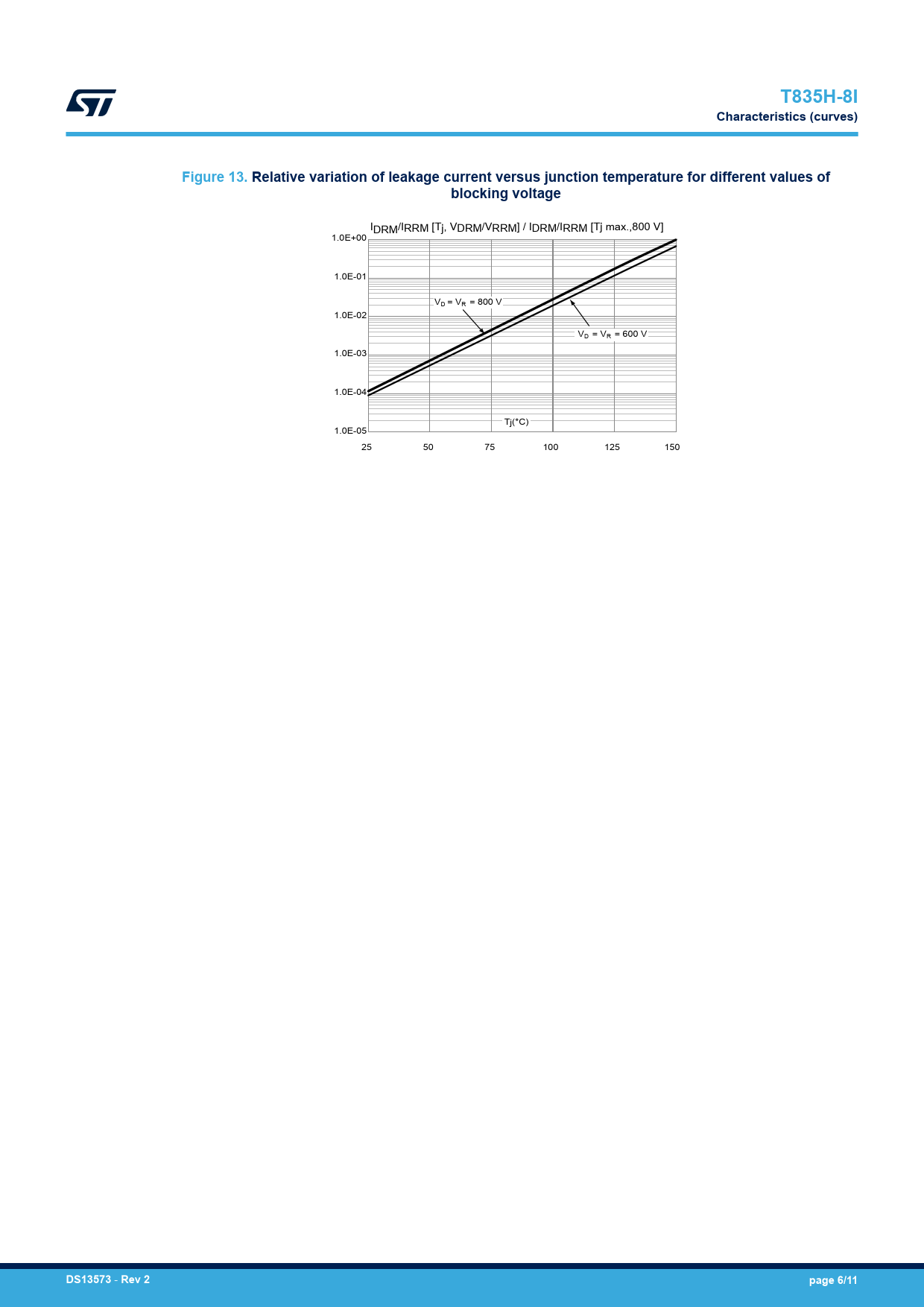 T835H-8I Characteristics (curves) Figure 13. Relative variation of leakage current versus junction temperature for different values of blocking voltage