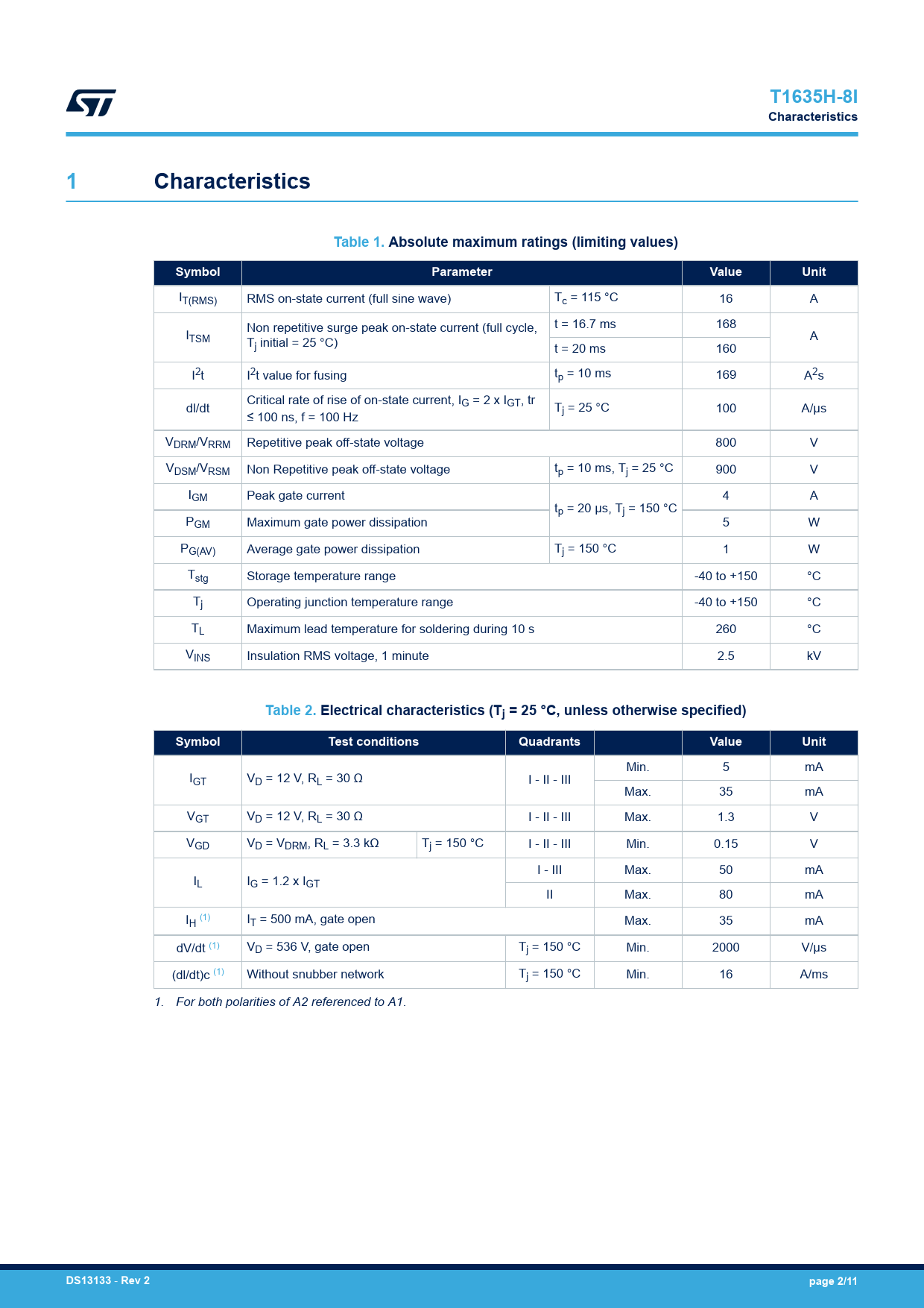 Seiten / Seite11 / 2 — T1635H-8I. Characteristics. Table 1. Absolute maximum ratings (limiting …