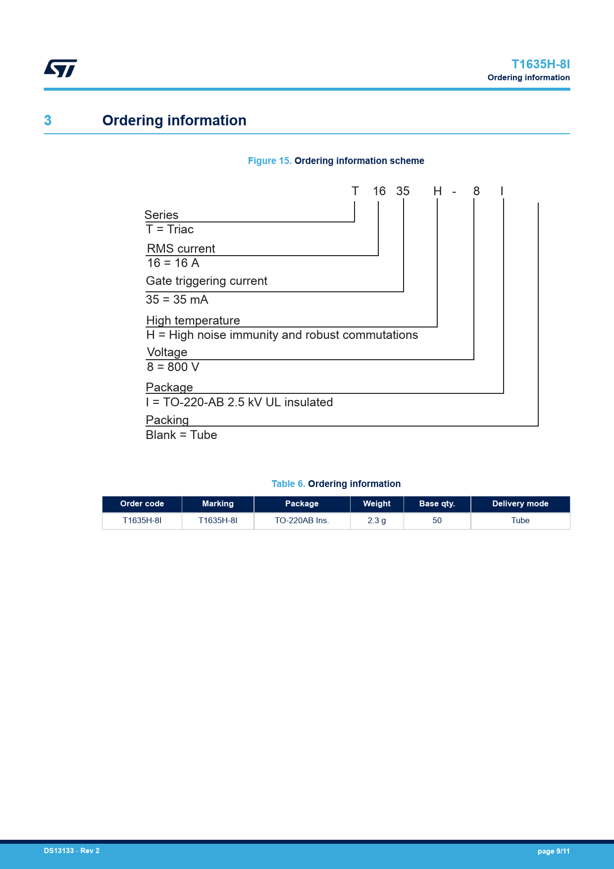 T1635H-8IOrdering information3Ordering informationFigure 15. Ordering information scheme T 16 35 H - 8 I Series T = Triac RMS current 16 = 16 A Gate triggering current 35 = 35 mA High temperature H = High noise immunity and robust commutations Voltage 8 = 800 V Package I = TO-220-AB 2.5 kV UL insulated Packing Blank = Tube Table 6. Ordering informationOrder codeMarkingPackageWeightBase qty.Delivery mode T1635H-8I T1635H-8I TO-220AB Ins. 2.3 g 50 Tube DS13133 - Rev 2page 9/11 Document Outline 1 Characteristics 1.1 Characteristics (curves) 2 Package information 2.1 TO-220AB insulated package information 3 Ordering information Revision history