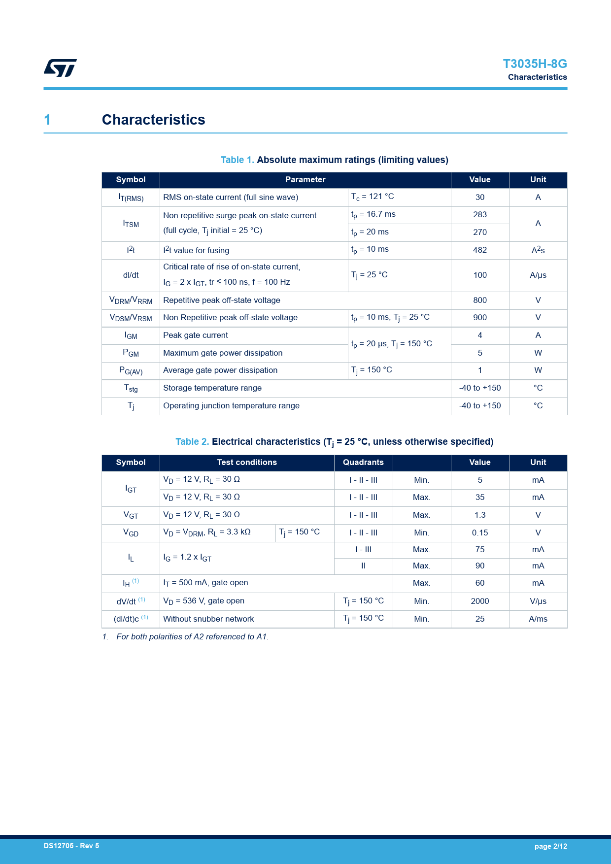 T3035H-8G Characteristics Table 1 Absolute maximum ratings (limiting values) Symbol Parameter Value Unit