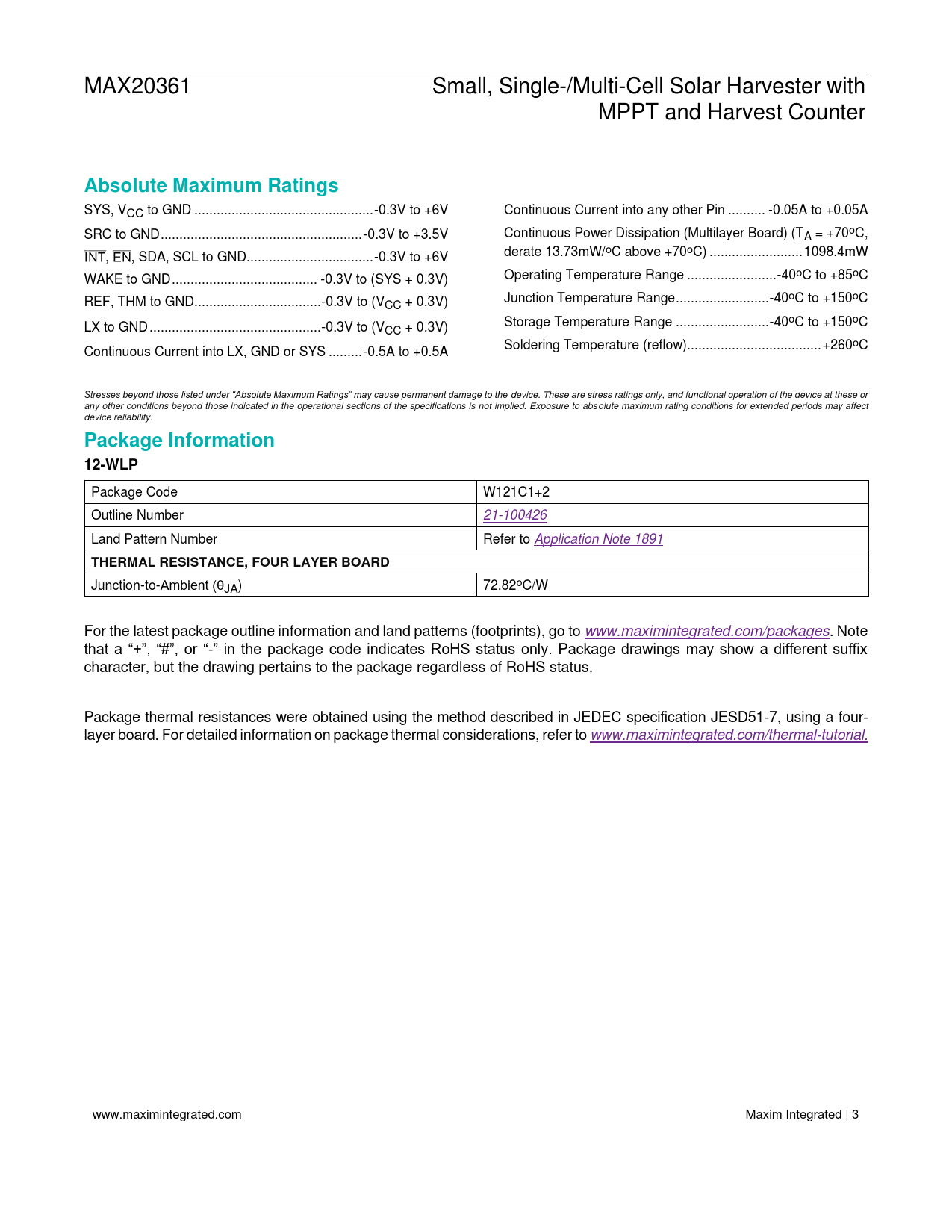 MAX20361 Small, Single-/Multi-Cell Solar Harvester with MPPT and Harvest Counter Absolute Maximum Ratings SYS, VCC to GND .. -0.3V to +6V Continuous Current into any other Pin .. -0.05A to +0.05A SRC to GND .. -0.3V to +3.5V Continuous Power Dissipation (Multilayer Board) (TA = +70oC, SDA, SCL to GND.. -0.3V to +6V derate 13.73mW/oC above +70oC) ... 1098.4mW WAKE to GND ... -0.3V to (SYS + 0.3V) Operating Temperature Range .. -40oC to +85oC REF, THM to GND.. -0.3V to (V Junction Temperature Range ... -40oC to +150oC CC + 0.3V) LX to GND .. -0.3V to (V Storage Temperature Range ... -40oC to +150oC CC + 0.3V) Soldering Temperature (reflow).. +260oC Continuous Current into LX, GND or SYS ... -0.5A to +0.5A Stresses beyond those listed under “Absolute Maximum Ratings” may cause permanent damage to the device. These are stress ratings only, and functional operation of the device at these or any other conditions beyond those indicated in the operational sections of the specifications is not implied. Exposure to absolute maximum rating conditions for extended periods may affect device reliability. Package Information 12-WLP Package Code W121C1+2 Outline Number 21-100426 Land Pattern Number Refer to Application Note 1891 THERMAL RESISTANCE, FOUR LAYER BOARD Junction-to-Ambient (θJA) 72.82oC/W For the latest package outline information and land patterns (footprints), go to www.maximintegrated.com/packages. Note that a “+”, “#”, or “-” in the package code indicates RoHS status only. Package drawings may show a different suffix character, but the drawing pertains to the package regardless of RoHS status. Package thermal resistances were obtained using the method described in JEDEC specification JESD51-7, using a four- layer board. For detailed information on package thermal considerations, refer to www.maximintegrated.com/thermal-tutorial. www.maximintegrated.com Maxim Integrated | 3 Document Outline General Description Applications Benefits and Features Simplified Block Diagram Absolute Maximum Ratings Package Information Electrical Characteristics Typical Operating Characteristics Bump Configuration Pin Descriptions Detailed Description Boost Converter Harvesting Meter Maximum Power Point Tracking (MPPT) Low-Light Sleep Mode WAKE Output Thermal Monitor Shutdown Cold-Startup Source Clamp I2C Interface Slave Address Bit Transfer Single-Byte Write Burst Write Single Byte Read Burst Read Acknowledge Bits Register Map Applications Information Inductor Selection Capacitor Selection SRC Capacitance SYS and VCC Capacitance nMOS Transistor Selection Typical Application Circuits Solar Application Circuit Ordering Information