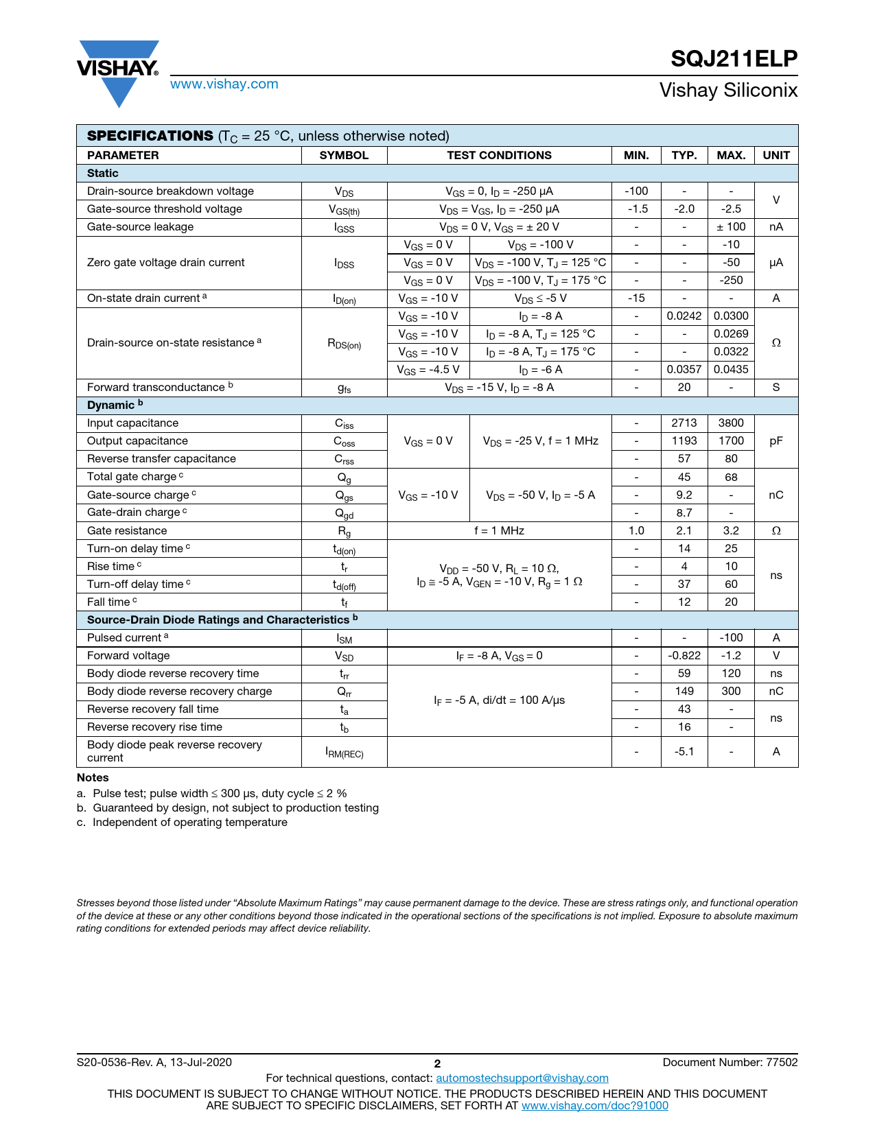 a. Pulse test; pulse width  300 μs, duty cycle  2 % b. Guaranteed by design, not subject to production testing c. Independent of operating temperature     Stresses beyond those listed under “Absolute Maximum Ratings” may cause permanent damage to the device. These are stress ratings only, and functional operation of the device at these or any other conditions beyond those indicated in the operational sections of the specifications is not implied. Exposure to absolute maximum rating conditions for extended periods may affect device reliability. S20-0536-Rev. A, 13-Jul-2020