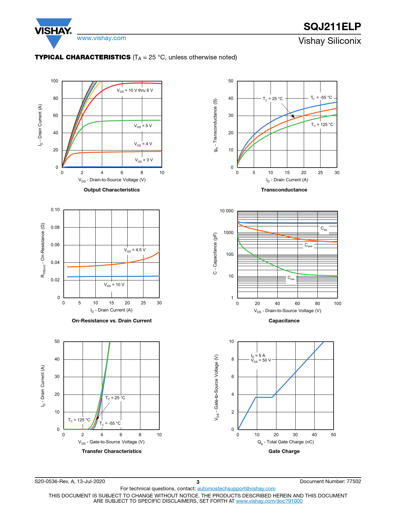 SQJ211ELP. TYPICAL CHARACTERISTICS. Output Characteristics. Transconductance. On-Resistance vs. Drain Current. Capacitance