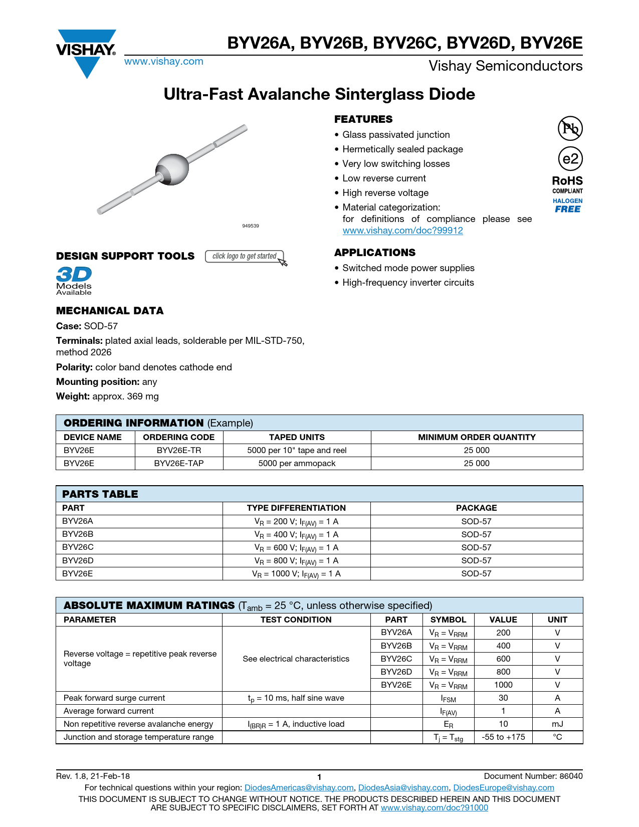 BYV26A, BYV26B, BYV26C, BYV26D, BYV26E www.vishay.com Vishay Semiconductors Ultra-Fast Avalanche Sinterglass DiodeFEATURES • Glass passivated junction • Hermetically sealed package • Very low switching losses • Low reverse current • High reverse voltage • Material categorization: for definitions of compliance please see 949539 www.vishay.com/doc?99912 DESIGN SUPPORT TOOLSAPPLICATIONS click logo to get started • Switched mode power supplies • High-frequency inverter circuits Models Available MECHANICAL DATA Case: SOD-57 Terminals: plated axial leads, solderable per MIL-STD-750, method 2026 Polarity: color band denotes cathode end Mounting position: any Weight: approx. 369 mg ORDERING INFORMATION (Example) DEVICE NAMEORDERING CODETAPED UNITSMINIMUM ORDER QUANTITY BYV26E BYV26E-TR 5000 per 10" tape and reel 25 000 BYV26E BYV26E-TAP 5000 per ammopack 25 000 PARTS TABLEPARTTYPE DIFFERENTIATIONPACKAGE BYV26A VR = 200 V; IF(AV) = 1 A SOD-57 BYV26B VR = 400 V; IF(AV) = 1 A SOD-57 BYV26C VR = 600 V; IF(AV) = 1 A SOD-57 BYV26D VR = 800 V; IF(AV) = 1 A SOD-57 BYV26E VR = 1000 V; IF(AV) = 1 A SOD-57 ABSOLUTE MAXIMUM RATINGS (Tamb = 25 °C, unless otherwise specified) PARAMETERTEST CONDITIONPARTSYMBOLVALUEUNIT BYV26A VR = VRRM 200 V BYV26B VR = VRRM 400 V Reverse voltage = repetitive peak reverse See electrical characteristics BYV26C V voltage R = VRRM 600 V BYV26D VR = VRRM 800 V BYV26E VR = VRRM 1000 V Peak forward surge current tp = 10 ms, half sine wave IFSM 30 A Average forward current IF(AV) 1 A Non repetitive reverse avalanche energy I(BR)R = 1 A, inductive load ER 10 mJ Junction and storage temperature range Tj = Tstg -55 to +175 °C Rev. 1.8, 21-Feb-18 1 Document Number: 86040 For technical questions within your region: DiodesAmericas@vishay.com, DiodesAsia@vishay.com, DiodesEurope@vishay.com THIS DOCUMENT IS SUBJECT TO CHANGE WITHOUT NOTICE. THE PRODUCTS DESCRIBED HEREIN AND THIS DOCUMENT ARE SUBJECT TO SPECIFIC DISCLAIMERS, SET FORTH AT www.vishay.com/doc?91000