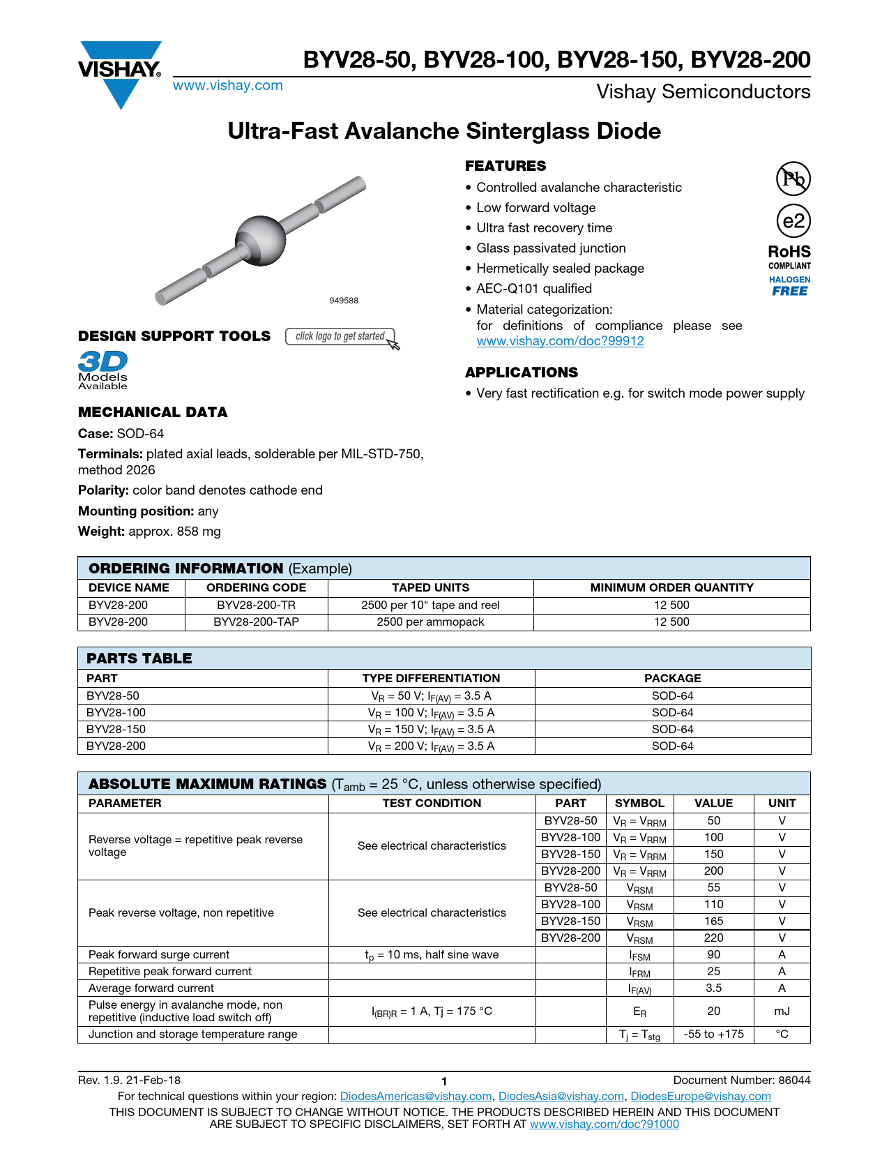 BYV28-50, BYV28-100, BYV28-150, BYV28-200 www.vishay.com Vishay Semiconductors Ultra-Fast Avalanche Sinterglass DiodeFEATURES • Controlled avalanche characteristic • Low forward voltage • Ultra fast recovery time • Glass passivated junction • Hermetically sealed package • AEC-Q101 qualified 949588 • Material categorization: for definitions of compliance please see DESIGN SUPPORT TOOLS click logo to get started www.vishay.com/doc?99912 APPLICATIONS Models Available • Very fast rectification e.g. for switch mode power supply MECHANICAL DATA Case: SOD-64 Terminals: plated axial leads, solderable per MIL-STD-750, method 2026 Polarity: color band denotes cathode end Mounting position: any Weight: approx. 858 mg ORDERING INFORMATION (Example) DEVICE NAMEORDERING CODETAPED UNITSMINIMUM ORDER QUANTITY BYV28-200 BYV28-200-TR 2500 per 10" tape and reel 12 500 BYV28-200 BYV28-200-TAP 2500 per ammopack 12 500 PARTS TABLEPARTTYPE DIFFERENTIATIONPACKAGE BYV28-50 VR = 50 V; IF(AV) = 3.5 A SOD-64 BYV28-100 VR = 100 V; IF(AV) = 3.5 A SOD-64 BYV28-150 VR = 150 V; IF(AV) = 3.5 A SOD-64 BYV28-200 VR = 200 V; IF(AV) = 3.5 A SOD-64 ABSOLUTE MAXIMUM RATINGS (Tamb = 25 °C, unless otherwise specified) PARAMETERTEST CONDITIONPARTSYMBOLVALUEUNIT BYV28-50 VR = VRRM 50 V Reverse voltage = repetitive peak reverse BYV28-100 VR = VRRM 100 V See electrical characteristics voltage BYV28-150 VR = VRRM 150 V BYV28-200 VR = VRRM 200 V BYV28-50 VRSM 55 V BYV28-100 VRSM 110 V Peak reverse voltage, non repetitive See electrical characteristics BYV28-150 VRSM 165 V BYV28-200 VRSM 220 V Peak forward surge current tp = 10 ms, half sine wave IFSM 90 A Repetitive peak forward current IFRM 25 A Average forward current IF(AV) 3.5 A Pulse energy in avalanche mode, non I repetitive (inductive load switch off) (BR)R = 1 A, Tj = 175 °C ER 20 mJ Junction and storage temperature range Tj = Tstg -55 to +175 °C Rev. 1.9. 21-Feb-18 1 Document Number: 86044 For technical questions within your region: DiodesAmericas@vishay.com, DiodesAsia@vishay.com, DiodesEurope@vishay.com THIS DOCUMENT IS SUBJECT TO CHANGE WITHOUT NOTICE. THE PRODUCTS DESCRIBED HEREIN AND THIS DOCUMENT ARE SUBJECT TO SPECIFIC DISCLAIMERS, SET FORTH AT www.vishay.com/doc?91000