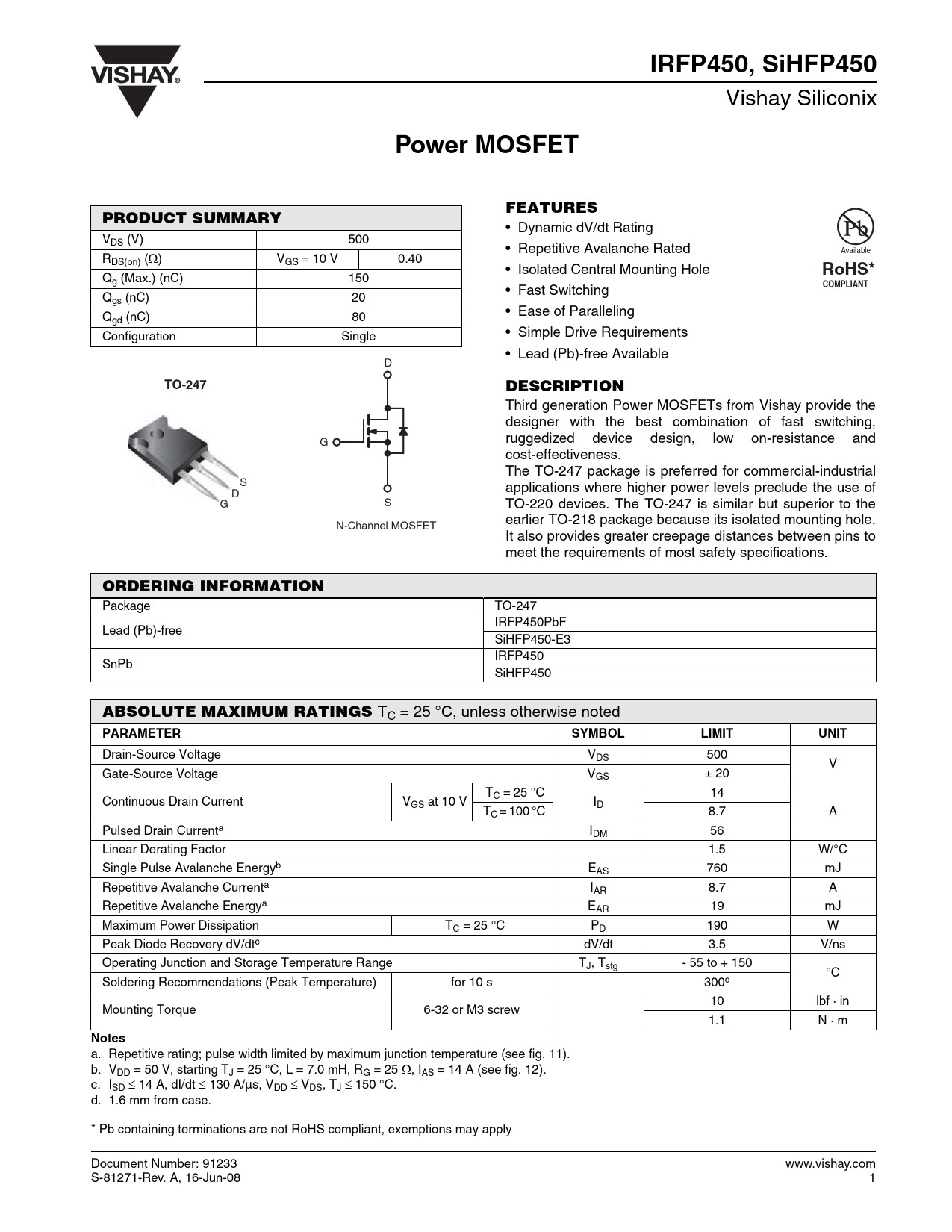 IRFP450, SiHFP450 Vishay Siliconix Power MOSFETFEATURESPRODUCT SUMMARY • Dynamic dV/dt Rating VDS (V) 500 • Repetitive Avalanche Rated Available RDS(on) (Ω) VGS = 10 V 0.40 • Isolated Central Mounting Hole RoHS* Qg (Max.) (nC) 150 COMPLIANT • Fast Switching Qgs (nC) 20 • Ease of Paralleling Qgd (nC) 80 • Simple Drive Requirements Configuration Single • Lead (Pb)-free Available D TO-247DESCRIPTION Third generation Power MOSFETs from Vishay provide the designer with the best combination of fast switching, ruggedized device design, low on-resistance and G cost-effectiveness. The TO-247 package is preferred for commercial-industrial S applications where higher power levels preclude the use of D G S TO-220 devices. The TO-247 is similar but superior to the earlier TO-218 package because its isolated mounting hole. N-Channel MOSFET It also provides greater creepage distances between pins to meet the requirements of most safety specifications. ORDERING INFORMATION Package TO-247 IRFP450PbF Lead (Pb)-free SiHFP450-E3 IRFP450 SnPb SiHFP450 ABSOLUTE MAXIMUM RATINGS TC = 25 °C, unless otherwise noted PARAMETER SYMBOLLIMITUNIT Drain-Source Voltage VDS 500 V Gate-Source Voltage VGS ± 20 TC = 25 °C 14 Continuous Drain Current VGS at 10 V ID T A C = 100 °C 8.7 Pulsed Drain Currenta IDM 56 Linear Derating Factor 1.5 W/°C Single Pulse Avalanche Energyb EAS 760 mJ Repetitive Avalanche Currenta IAR 8.7 A Repetitive Avalanche Energya EAR 19 mJ Maximum Power Dissipation TC = 25 °C PD 190 W Peak Diode Recovery dV/dtc dV/dt 3.5 V/ns Operating Junction and Storage Temperature Range TJ, Tstg - 55 to + 150 °C Soldering Recommendations (Peak Temperature) for 10 s 300d 10 lbf · in Mounting Torque 6-32 or M3 screw 1.1 N · m Notes a. Repetitive rating; pulse width limited by maximum junction temperature (see fig. 11). b. VDD = 50 V, starting TJ = 25 °C, L = 7.0 mH, RG = 25 Ω, IAS = 14 A (see fig. 12). c. ISD ≤ 14 A, dI/dt ≤ 130 A/µs, VDD ≤ VDS, TJ ≤ 150 °C. d. 1.6 mm from case. * Pb containing terminations are not RoHS compliant, exemptions may apply Document Number: 91233 www.vishay.com S-81271-Rev. A, 16-Jun-08 1