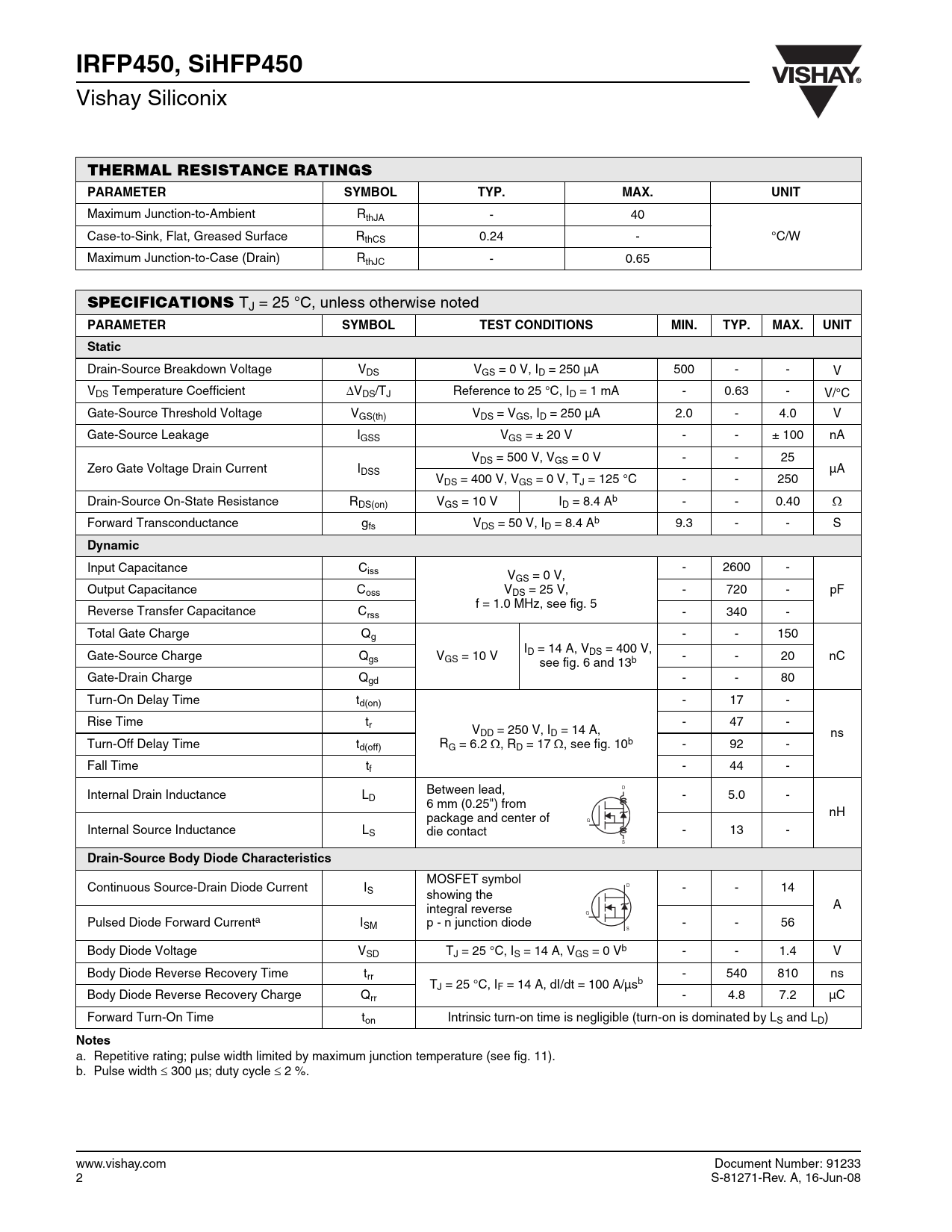 IRFP450, SiHFP450. THERMAL RESISTANCE RATINGS. PARAMETER SYMBOL. TYP. MAX. UNIT. SPECIFICATIONS. TEST. CONDITIONS. MIN. Static. Dynamic