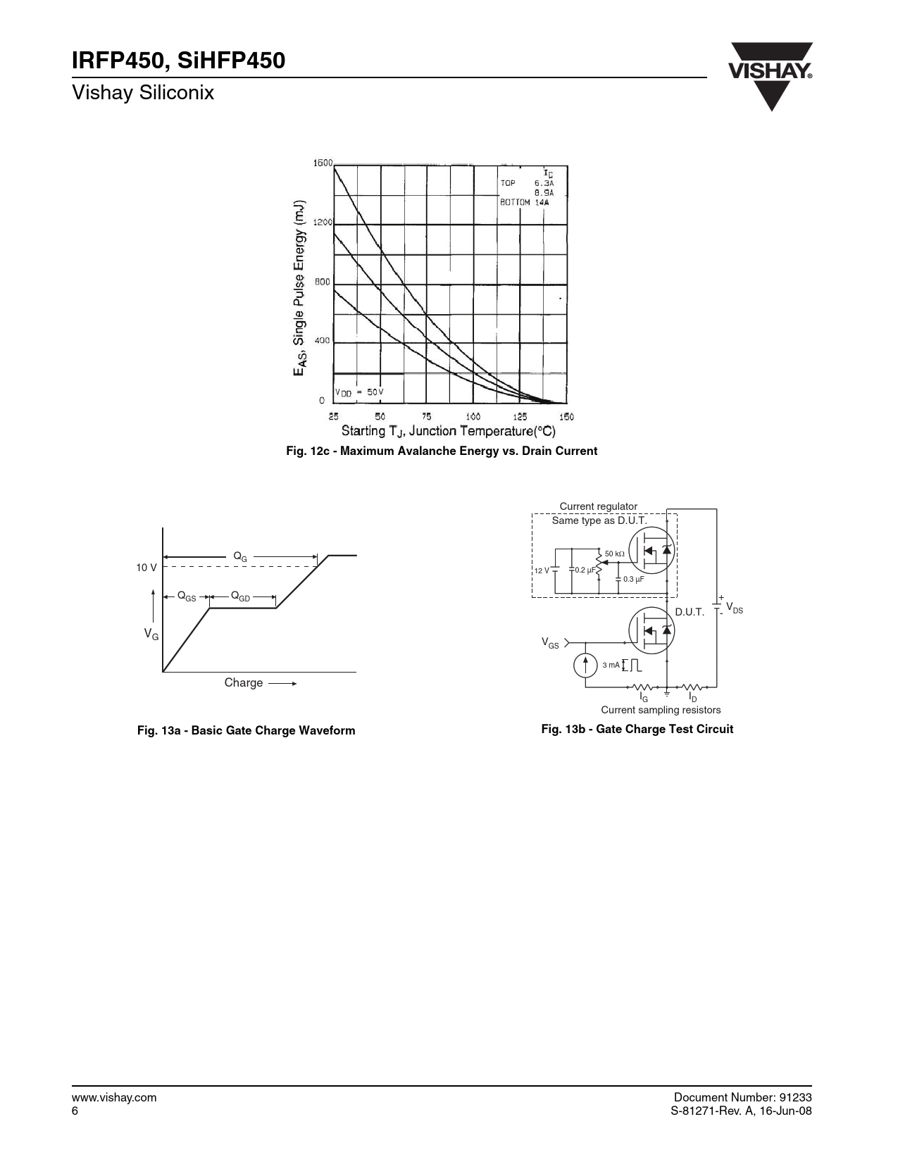 IRFP450, SiHFP450 Vishay Siliconix Fig. 12c - Maximum Avalanche Energy vs. Drain Current Current regulator Same type as D.U.T. Q 50 kΩ G 10 V 12 V 0.2 µF 0.3 µF Q Q GS GD + V D.U.T. DS - VG VGS 3 mA Charge I I G D Current sampling resistors Fig. 13a - Basic Gate Charge WaveformFig. 13b - Gate Charge Test Circuit www.vishay.com Document Number: 91233 6 S-81271-Rev. A, 16-Jun-08