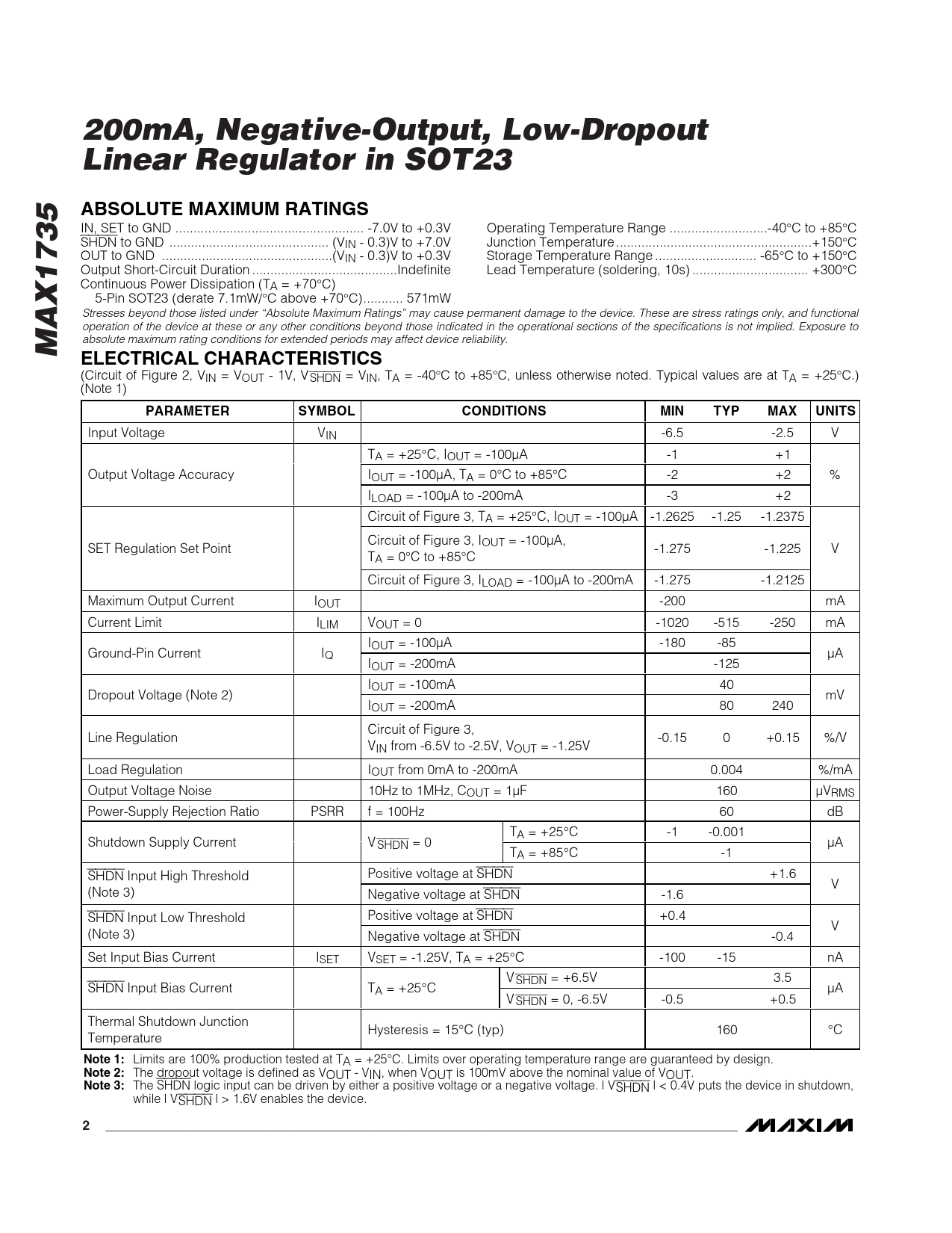 200mA, Negative-Output, Low-Dropout Linear Regulator in SOT23ABSOLUTE MAXIMUM RATINGS IN, SET to GND .. -7.0V to +0.3V Operating Temperature Range ...-40°C to +85°C SHDN to GND .. (VIN - 0.3)V to +7.0V Junction Temperature ..+150°C OUT to GND ...(VIN - 0.3)V to +0.3V Storage Temperature Range .. -65°C to +150°C Output Short-Circuit Duration ..Indefinite Lead Temperature (soldering, 10s) .. +300°C Continuous Power Dissipation (TA = +70°C) 5-Pin SOT23 (derate 7.1mW/°C above +70°C)... 571mW Stresses beyond those listed under “Absolute Maximum Ratings” may cause permanent damage to the device. These are stress ratings only, and functional operation of the device at these or any other conditions beyond those indicated in the operational sections of the specifications is not implied. Exposure to MAX1735 absolute maximum rating conditions for extended periods may affect device reliability. ELECTRICAL CHARACTERISTICS (Circuit of Figure 2, VIN = VOUT - 1V, VSHDN = VIN, TA = -40°C to +85°C, unless otherwise noted. Typical values are at TA = +25°C.) (Note 1) PARAMETERSYMBOLCONDITIONSMINTYPMAXUNITS Input Voltage VIN -6.5 -2.5 V TA = +25°C, IOUT = -100µA -1 +1 Output Voltage Accuracy IOUT = -100µA, TA = 0°C to +85°C -2 +2 % ILOAD = -100µA to -200mA -3 +2 Circuit of Figure 3, TA = +25°C, IOUT = -100µA -1.2625 -1.25 -1.2375 Circuit of Figure 3, IOUT = -100µA, SET Regulation Set Point -1.275 -1.225 V TA = 0°C to +85°C Circuit of Figure 3, ILOAD = -100µA to -200mA -1.275 -1.2125 Maximum Output Current IOUT -200 mA Current Limit ILIM VOUT = 0 -1020 -515 -250 mA IOUT = -100µA -180 -85 Ground-Pin Current IQ µA IOUT = -200mA -125 IOUT = -100mA 40 Dropout Voltage (Note 2) mV IOUT = -200mA 80 240 Circuit of Figure 3, Line Regulation -0.15 0 +0.15 %/V VIN from -6.5V to -2.5V, VOUT = -1.25V Load Regulation IOUT from 0mA to -200mA 0.004 %/mA Output Voltage Noise 10Hz to 1MHz, COUT = 1µF 160 µVRMS Power-Supply Rejection Ratio PSRR f = 100Hz 60 dB TA = +25°C -1 -0.001 Shutdown Supply Current V SHDN = 0 µA TA = +85°C -1 SHDN Input High Threshold Positive voltage at SHDN +1.6 V (Note 3) Negative voltage at SHDN -1.6 SHDN Input Low Threshold Positive voltage at SHDN +0.4 V (Note 3) Negative voltage at SHDN -0.4 Set Input Bias Current ISET VSET = -1.25V, TA = +25°C -100 -15 nA V SHDN = +6.5V 3.5 SHDN Input Bias Current TA = +25°C µA V SHDN = 0, -6.5V -0.5 +0.5 Thermal Shutdown Junction Hysteresis = 15°C (typ) 160 °C Temperature Note 1: Limits are 100% production tested at TA = +25°C. Limits over operating temperature range are guaranteed by design. Note 2: The dropout voltage is defined as VOUT - VIN, when VOUT is 100mV above the nominal value of VOUT. Note 3: The SHDN logic input can be driven by either a positive voltage or a negative voltage. | VSHDN | < 0.4V puts the device in shutdown, while | VSHDN | > 1.6V enables the device. 2_______________________________________________________________________________________