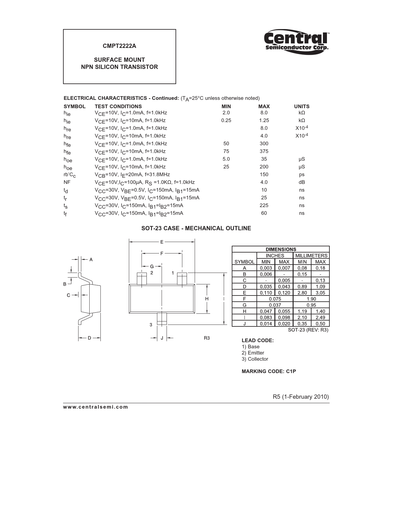 CMPT2222A. SURFACE MOUNT. NPN SILICON TRANSISTOR. ELECTRICAL CHARACTERISTICS - Continued:. SYMBOL TEST. CONDITIONS. MIN. MAX. UNITS