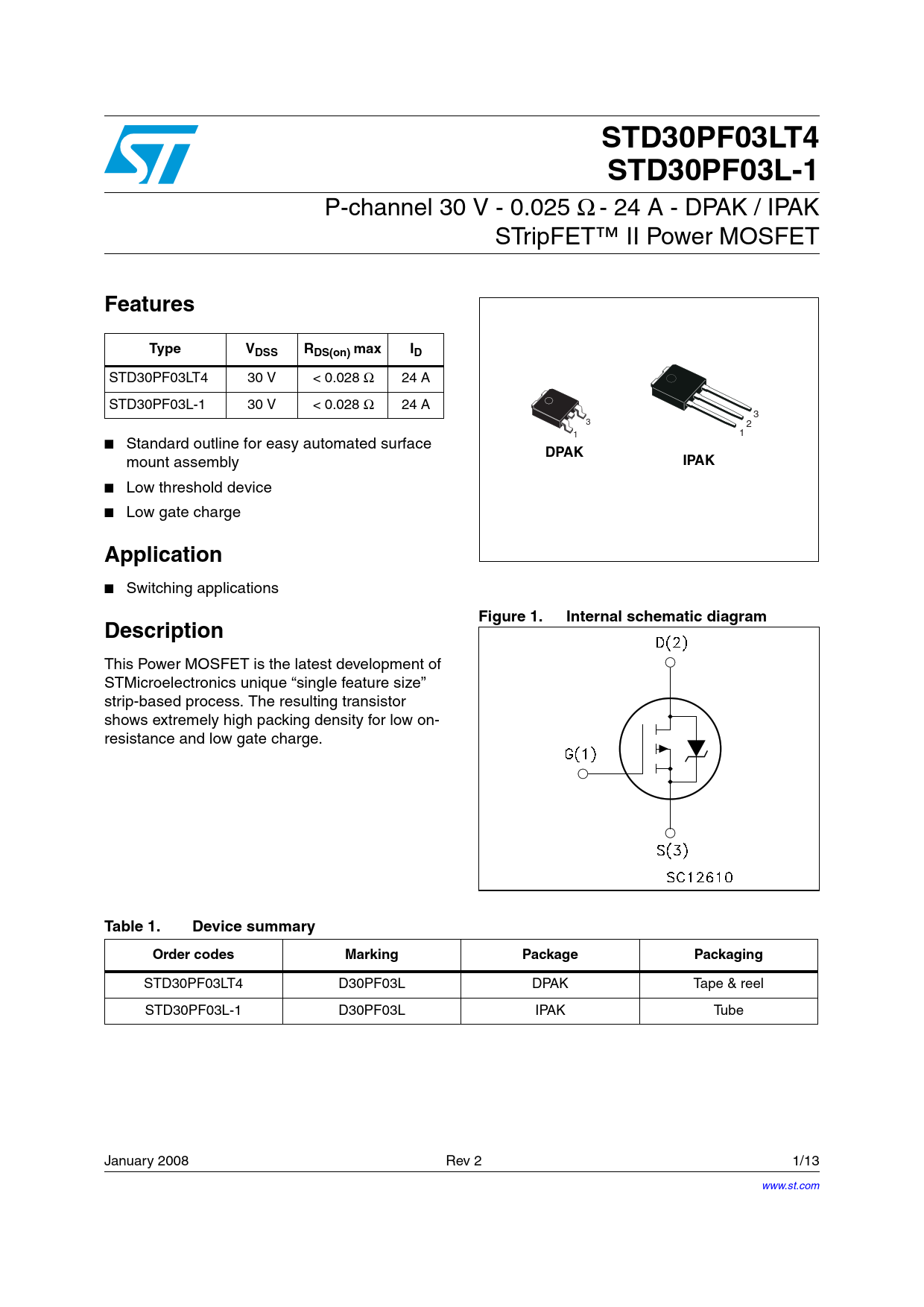STD30PF03LT4 D30PF03L DPAK Tape & reel STD30PF03L-1 D30PF03L IPAK Tube January 2008 Rev 2 1/13 www.st.com 13 Document Outline Figure 1. Internal schematic diagram Table 1. Device summary 1 Electrical ratings Table 2. Absolute maximum ratings Table 3. Thermal data 2 Electrical characteristics Table 4. On/off states Table 5. Dynamic Table 6. Switching times Table 7. Source drain diode 2.1 Electrical characteristics (curves) Figure 2. Safe operating area Figure 3. Thermal impedance Figure 4. Output characteristics Figure 5. Transfer characteristics Figure 6. Transconductance Figure 7. Static drain-source on resistance Figure 8. Gate charge vs gate-source voltage Figure 9. Capacitance variations Figure 10. Normalized gate threshold voltage vs temperature Figure 11. Normalized on resistance vs temperature Figure 12. Source-drain diode forward characteristics Figure 13. Normalized breakdown voltage vs temperature 3 Test circuit Figure 14. Switching times test circuit for resistive load Figure 15. Gate charge test circuit Figure 16. Test circuit for diode recovery behavior 4 Package mechanical data 5 Packaging mechanical data 6 Revision history Table 8. Document revision history