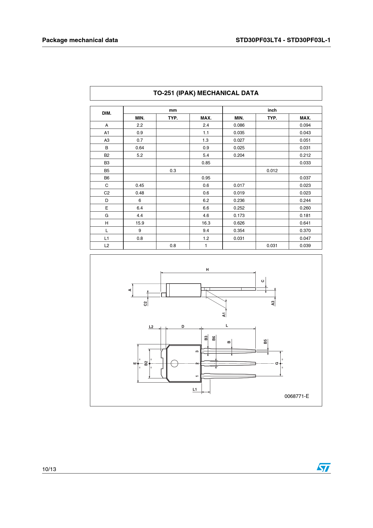 Package mechanical data. STD30PF03LT4 - STD30PF03L-1. TO-251 (IPAK) MECHANICAL DATA. inch. DIM. MIN. TYP. MAX. 1 3