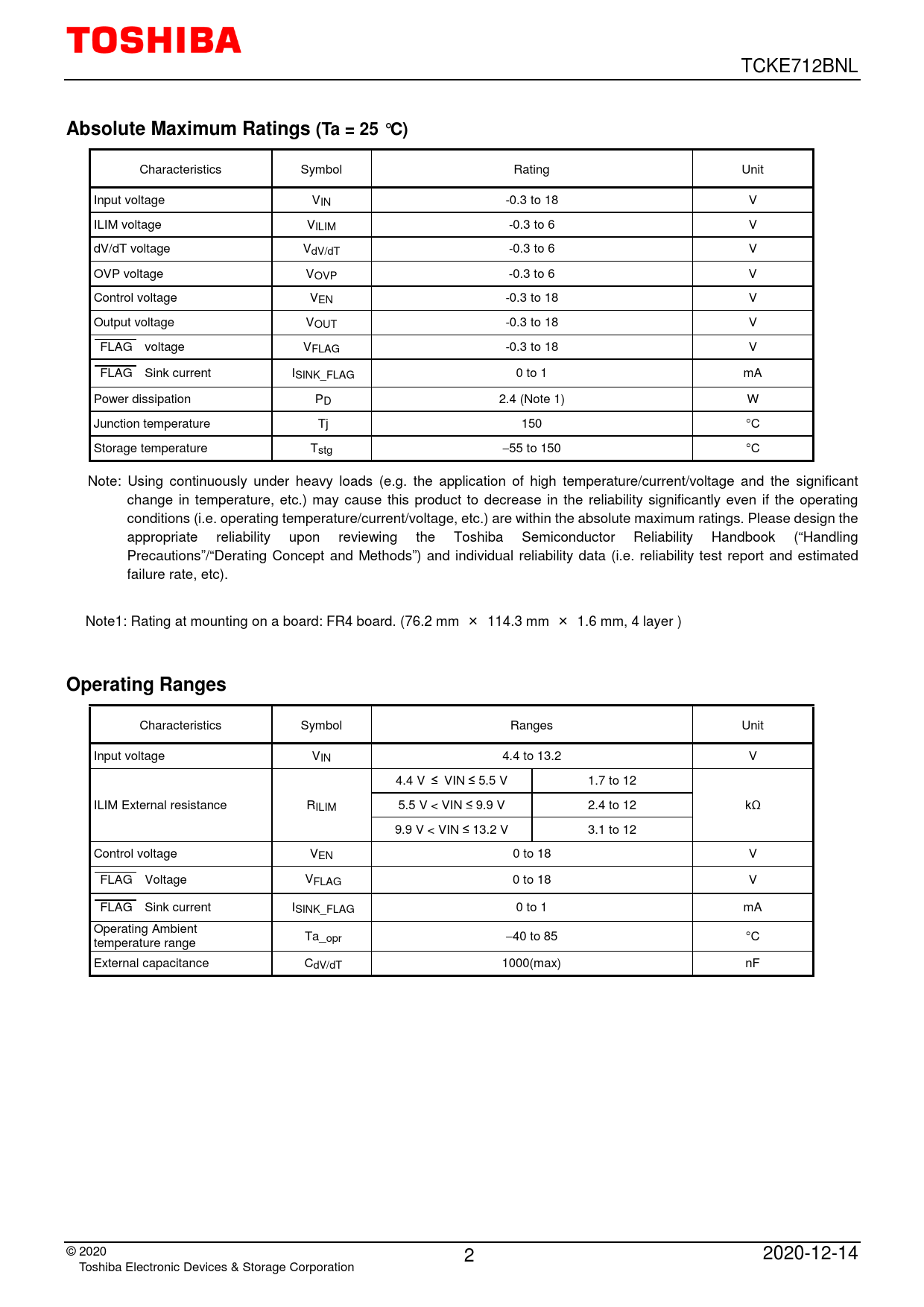 Characteristics Symbol Rating Unit Input voltage VIN -0.3 to 18 V ILIM voltage VILIM -0.3 to 6 V dV/dT voltage VdV/dT -0.3 to 6 V OVP voltage VOVP -0.3 to 6 V Control voltage VEN -0.3 to 18 V Output voltage VOUT -0.3 to 18 V FLAG voltage VFLAG -0.3 to 18 V FLAG Sink current ISINK_FLAG 0 to 1 mA Power dissipation PD 2.4 (Note 1) W Junction temperature Tj 150 °C Storage temperature Tstg − 55 to 150 °C Note: Using continuously under heavy loads (e.g. the application of high temperature/current/voltage and the significant change in temperature, etc.) may cause this product to decrease in the reliability significantly even if the operating conditions (i.e. operating temperature/current/voltage, etc.) are within the absolute maximum ratings. Please design the appropriate reliability upon reviewing the Toshiba Semiconductor Reliability Handbook (“Handling Precautions”/“Derating Concept and Methods”) and individual reliability data (i.e. reliability test report and estimated failure rate, etc). Note1: Rating at mounting on a board: FR4 board. (76.2 mm × 114.3 mm × 1.6 mm, 4 layer )