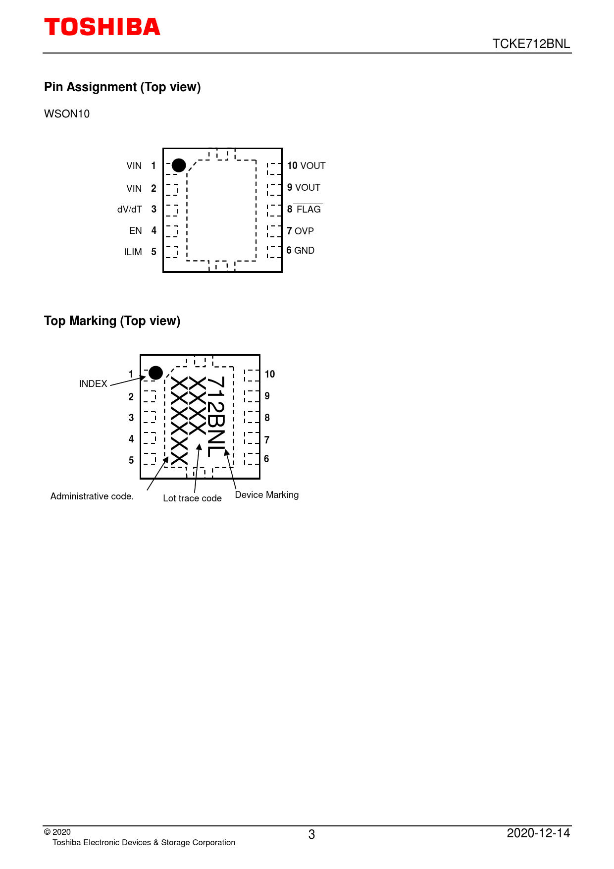 Device Marking Administrative code. Lot trace code © 2020 3 2020-12-14 Toshiba Electronic Devices & Storage Corporation