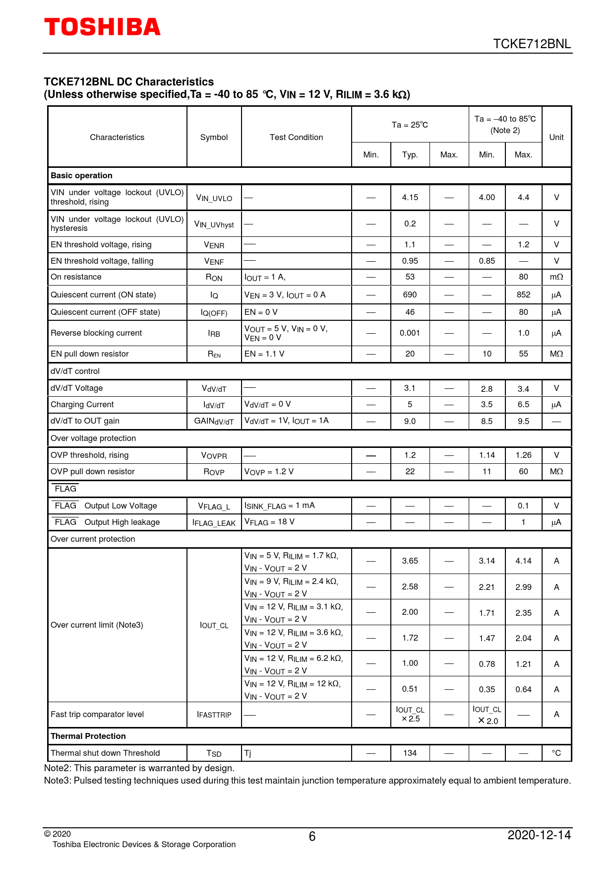 TCKE712BNL DC Characteristics (Unless otherwise specified,Ta = -40 to 85 °C, VIN = 12 V, RILIM = 3.6 k. Basic operation