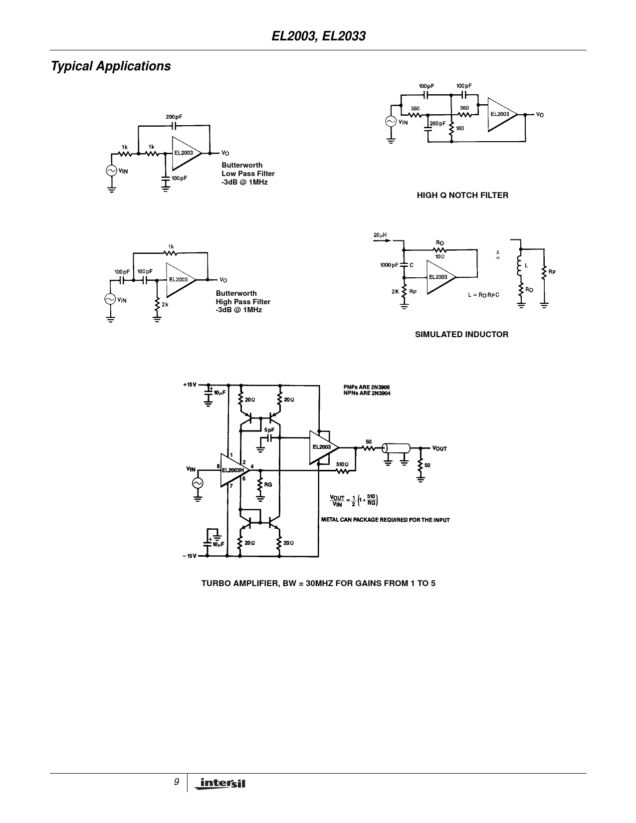 EL2003, EL2033 Typical Applications Butterworth Low Pass Filter -3dB @ 1MHz HIGH Q NOTCH FILTER Butterworth High Pass Filter -3dB @ 1MHz SIMULATED INDUCTOR TURBO AMPLIFIER, BW = 30MHZ FOR GAINS FROM 1 TO 5