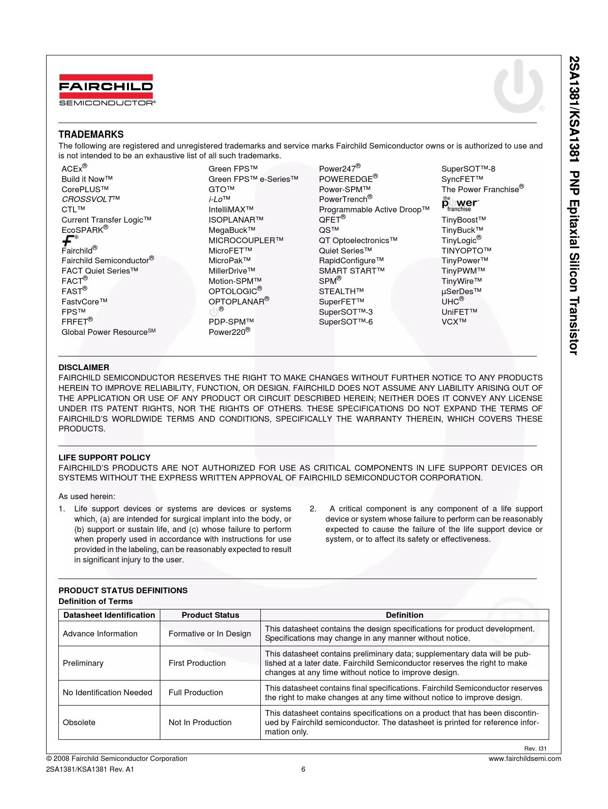 2SA1381/KSA1381 PNP Ep2SA1381/KSA1381. TRADEMARKS. axial Silico. n T. ran. sistor. DISCLAIMER. LIFE SUPPORT POLICY