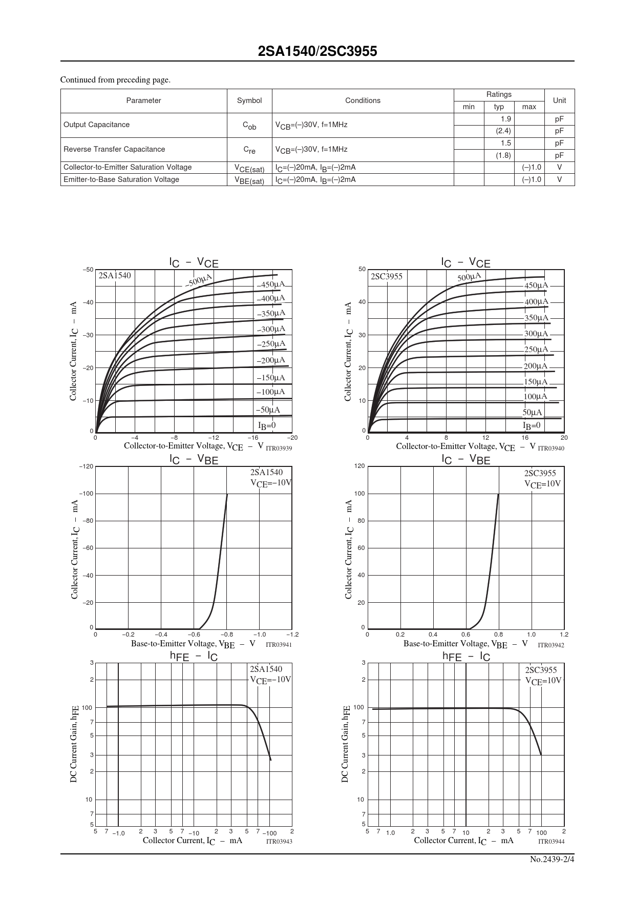 Continued from preceding page. t a R s g n i m a r a P r e t e y S o b m l t i d n o C n o i s n U t i n i m p y t x a m 9 . 1 F p O t u p t u c a p a C e c n a t i C b o V B C , V 0 3 ) – ( = z H M 1 = f ) 4 . 2 ( pF 1 5 . F p e R e v r e s T r e f s n a r C e c n a t i c a p a C e r VCB ( = V 0 3 ) – , 1 = f H M z ) 8 . 1 ( F p o C l o t c e l t - r r e t t i m E - o r u t a S n o i t a t l o V e g a V ( E C s t a ) IC m 0 2 ) – ( = , A IB A m 2 ) – ( = 1 ) – ( 0 . V - r e t t i m E s a B - o t e r u t a S n o i t a e g a t l o V V ( E B t a s ) IC ) – ( = , A m 0 2 IB 2 ) – ( = A m 1 ) – ( 0 . V I I C -- VCE C -- VCE --50 50 2SA1540 2SC3955 µA 500µA --500 --450µA 450µA --40 --400µA 40 400µA A A --350µA 350µA –m –m --300µA I C --30 I C 30 300µA --250µA 250µA --200µA --20 20 200µA --150µA 150µA --100µA 100 Collector Current, µA --10 Collector Current, 10 --50µA 50µA IB=0 IB=0 0 0 0 --4 --8 --12 --16 --20 0 4 8 12 16 20 Collector-to-Emitter Voltage, VCE – V ITR03939 Collector-to-Emitter Voltage, VCE – V ITR03940 I I C -- VBE C -- VBE --120 120 2SA1540 2SC3955 VCE=--10V VCE=10V --100 100 A A –m --80 –m 80 I C I C --60 60 --40 40 Collector Current, Collector Current, --20 20 0 0 0 --0.2 --0.4 --0.6 --0.8 --1.0 --1.2 0 0.2 0.4 0.6 0.8 1.0 1.2 Base-to-Emitter Voltage, V ITR03941 Base-to-Emitter Voltage, V ITR03942 BE – V BE – V h h FE -- IC FE -- IC 3 3 2SA1540 2SC3955 2 VCE=--10V 2 VCE=10V 100 100 FE FE h h 7 7 5 5 3 3 2 2 DC Current Gain, DC Current Gain, 10 10 7 7 5 5 5 7 --1.0 2 3 5 7 --10 2 3 5 7 2 --100 5 7 1.0 2 3 5 7 10 2 3 5 7 2 100 Collector Current, I ITR03943 Collector Current, I ITR03944 C – mA C – mA No.2439-2/4
