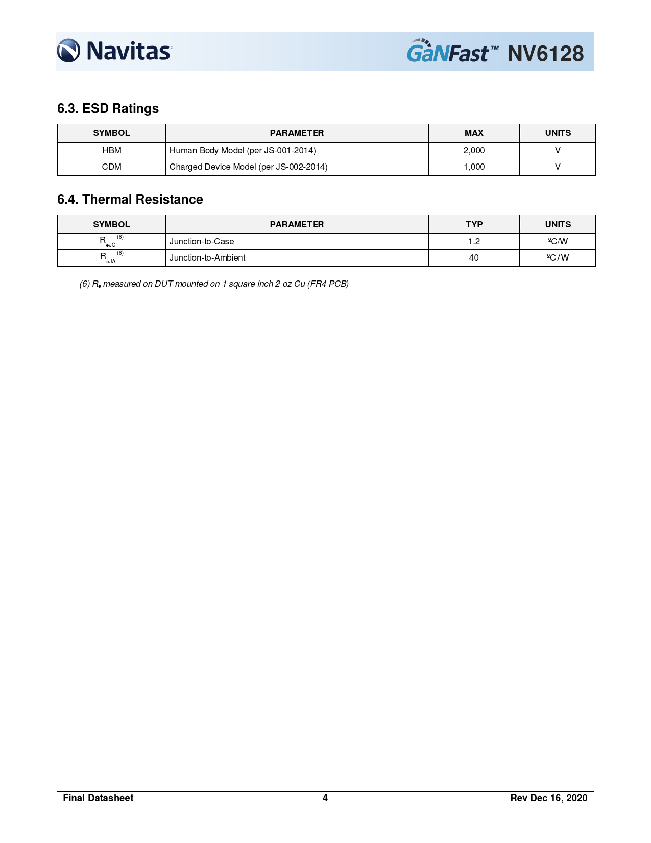 NV6128. 6.3. ESD Ratings. SYMBOL. PARAMETER. MAX. UNITS. 6.4. Thermal Resistance. TYP. Final Datasheet. Rev Dec 16, 2020