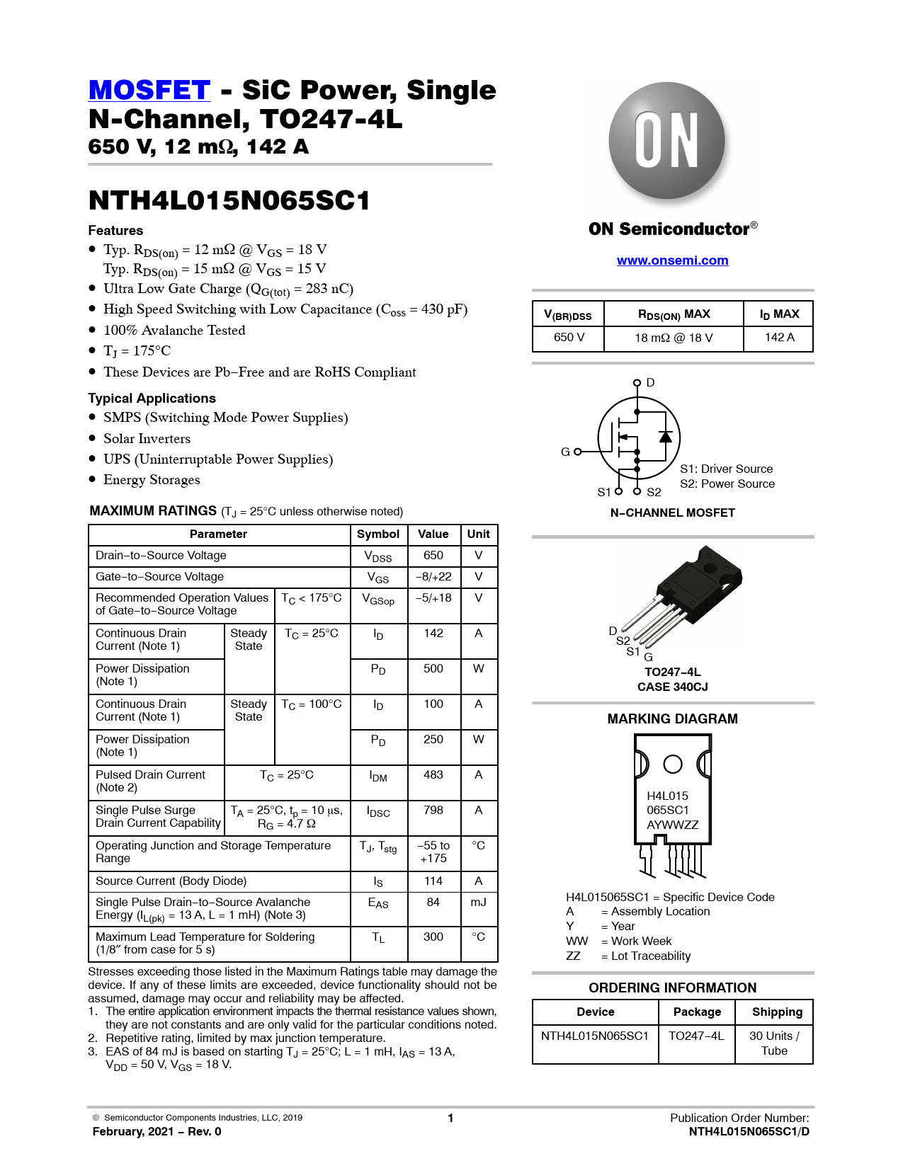February, 2021 − Rev. 0 NTH4L015N065SC1/D