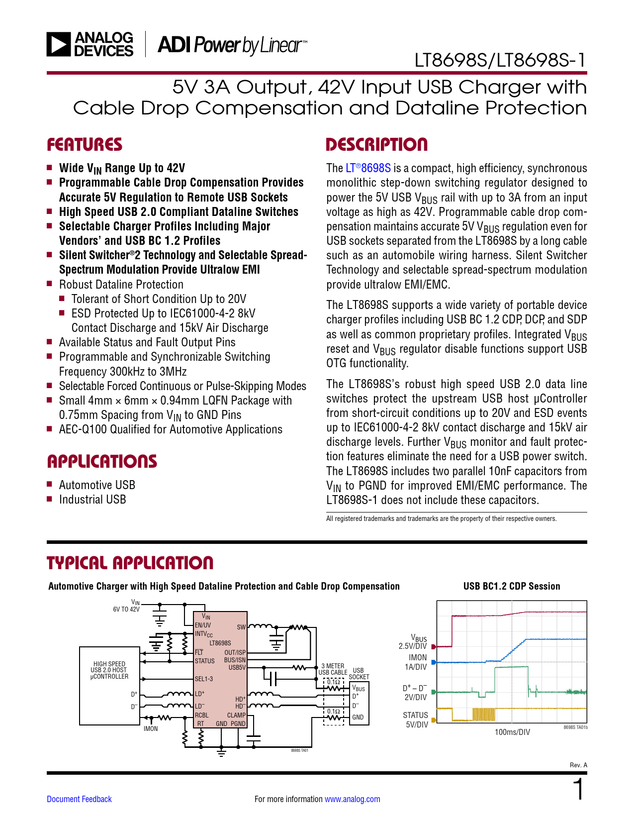 LT8698S/LT8698S-1 5V 3A Output, 42V Input USB Charger with Cable Drop Compensation and Dataline Protection FEATURESDESCRIPTION n Wide VIN Range Up to 42V The LT®8698S is a compact, high efficiency, synchronous n Programmable Cable Drop Compensation Provides monolithic step-down switching regulator designed to Accurate 5V Regulation to Remote USB Sockets power the 5V USB VBUS rail with up to 3A from an input n High Speed USB 2.0 Compliant Dataline Switches voltage as high as 42V. Programmable cable drop com- n Selectable Charger Profiles Including Major pensation maintains accurate 5V VBUS regulation even for Vendors’ and USB BC 1.2 Profiles USB sockets separated from the LT8698S by a long cable n Silent Switcher®2 Technology and Selectable Spread- such as an automobile wiring harness. Silent Switcher Spectrum Modulation Provide Ultralow EMI Technology and selectable spread-spectrum modulation n Robust Dataline Protection provide ultralow EMI/EMC. n Tolerant of Short Condition Up to 20V The LT8698S supports a wide variety of portable device n ESD Protected Up to IEC61000-4-2 8kV charger profiles including USB BC 1.2 CDP, DCP, and SDP Contact Discharge and 15kV Air Discharge as well as common proprietary profiles. Integrated VBUS n Available Status and Fault Output Pins reset and VBUS regulator disable functions support USB n Programmable and Synchronizable Switching OTG functionality. Frequency 300kHz to 3MHz n Selectable Forced Continuous or Pulse-Skipping Modes The LT8698S’s robust high speed USB 2.0 data line n Small 4mm × 6mm × 0.94mm LQFN Package with switches protect the upstream USB host µController 0.75mm Spacing from V from short-circuit conditions up to 20V and ESD events IN to GND Pins n AEC-Q100 Qualified for Automotive Applications up to IEC61000-4-2 8kV contact discharge and 15kV air discharge levels. Further VBUS monitor and fault protec- tion features eliminate the need for a USB power switch. APPLICATIONS The LT8698S includes two parallel 10nF capacitors from n Automotive USB VIN to PGND for improved EMI/EMC performance. The n Industrial USB LT8698S-1 does not include these capacitors. All registered trademarks and trademarks are the property of their respective owners. TYPICAL APPLICATIONAutomotive Charger with High Speed Dataline Protection and Cable Drop CompensationUSB BC1.2 CDP Session VIN 6V TO 42V VIN EN/UV SW INTVCC V LT8698S BUS 2.5V/DIV FLT OUT/ISP STATUS BUS/ISN IMON HIGH SPEED USB5V 3 METER USB 2.0 HOST 1A/DIV USB CABLE USB µCONTROLLER SOCKET SEL1-3 0.1Ω VBUS D+ – D– D+ LD+ HD+ D+ 2V/DIV D– LD– HD– D– 0.1Ω RCBL CLAMP GND STATUS RT GND PGND 5V/DIV IMON 8698S TA01b 100ms/DIV 8698S TA01 Rev. A Document Feedback For more information www.analog.com 1 Document Outline Features Applications Typical Application Description Absolute Maximum Ratings Order Information Pin Configuration Electrical Characteristics Typical Performance Characteristics Pin Functions Block Diagram Operation Applications Information Typical Applications Package Description Related Parts