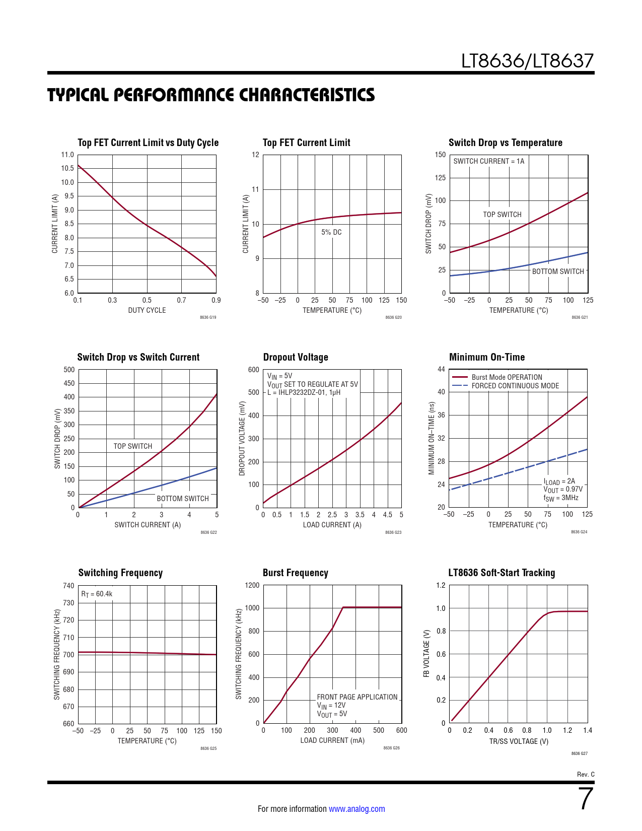 500 600 44 VIN = 5V Burst Mode OPERATION 450 VOUT SET TO REGULATE AT 5V FORCED CONTINUOUS MODE 500 L = IHLP3232DZ-01, 1µH 40 400 350 400 36 300 TAGE (mV) 250 300 32 TOP SWITCH 200 28 SWITCH DROP (mV) 200 150 DROPOUT VOL MINIMUM ON–TIME (ns) 100 100 ILOAD = 2A 24 V 50 OUT = 0.97V BOTTOM SWITCH fSW = 3MHz 0 0 20 0 1 2 3 4 5 0 0.5 1 1.5 2 2.5 3 3.5 4 4.5 5 –50 –25 0 25 50 75 100 125 SWITCH CURRENT (A) LOAD CURRENT (A) TEMPERATURE (°C) 8636 G22 8636 G23 8636 G24