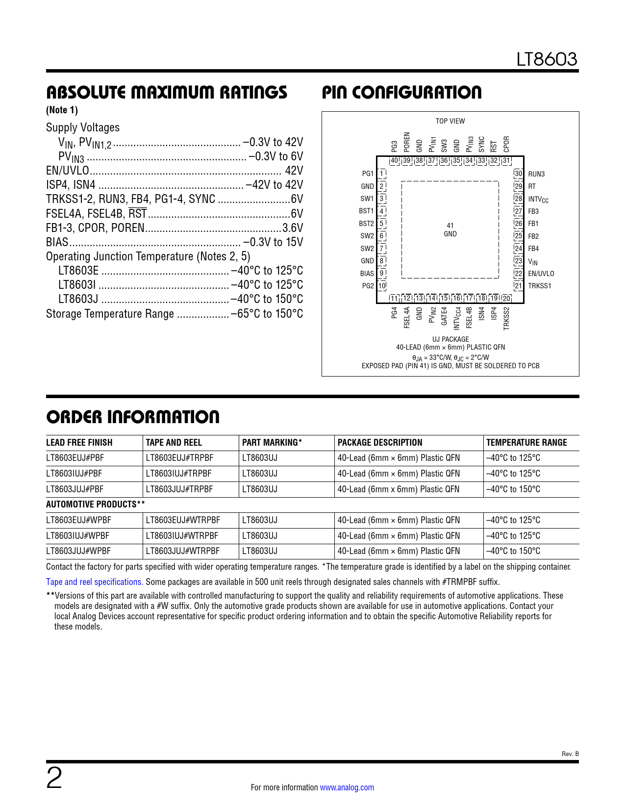 LT8603EUJ#PBF LT8603EUJ#TRPBF LT8603UJ 40-Lead (6mm × 6mm) Plastic QFN –40°C to 125°C LT8603IUJ#PBF LT8603IUJ#TRPBF LT8603UJ 40-Lead (6mm × 6mm) Plastic QFN –40°C to 125°C LT8603JUJ#PBF LT8603JUJ#TRPBF LT8603UJ 40-Lead (6mm x 6mm) Plastic QFN –40°C to 150°C