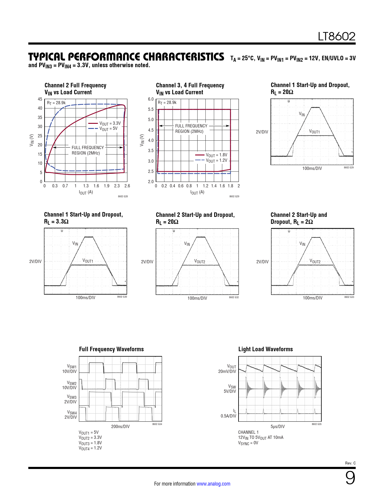TYPICAL PERFORMANCE CHARACTERISTICS TA = 25°C, VIN = PVIN1 = PVIN2 = 12V, EN/UVLO = 3V and PVIN3 = PVIN4 = 3.3V, unless otherwise noted. Channel 2 Full Frequency Channel 3, 4 Full Frequency Channel 1 Start-Up and Dropout, VIN vs Load Current VIN vs Load Current RL = 20Ω