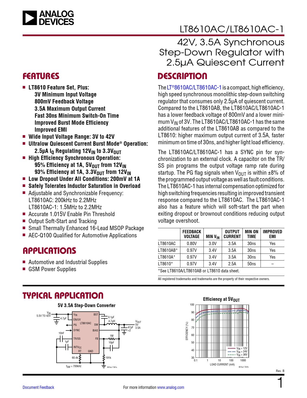 LT8610AC/LT8610AC-1 42V, 3.5A Synchronous Step-Down Regulator with 2.5µA Quiescent Current FEATURESDESCRIPTION n LT8610 Feature Set, Plus: The LT®8610AC/LT8610AC-1 is a compact, high efficiency, 3V Minimum Input Voltage high speed synchronous monolithic step-down switching 800mV Feedback Voltage regulator that consumes only 2.5µA of quiescent current. 3.5A Maximum Output Current Compared to the LT8610AB, the LT8610AC/LT8610AC-1 Fast 30ns Minimum Switch-On Time has a lower feedback voltage of 800mV and a lower mini- Improved Burst Mode Efficiency mum VIN of 3V. The LT8610AC/LT8610AC-1 has the same Improved EMI additional features of the LT8610AB as compared to the n Wide Input Voltage Range: 3V to 42V LT8610: higher maximum output current of 3.5A, faster n minimum on time of 30ns, and higher light load efficiency. Ultralow Quiescent Current Burst Mode® Operation:2.5μA IQ Regulating 12VIN to 3.3VOUT The LT8610AC/LT8610AC-1 has a SYNC pin for syn- n High Efficiency Synchronous Operation: chronization to an external clock. A capacitor on the TR/ 95%Efficiency at 1A, 5VOUT from 12VIN SS pin programs the output voltage ramp rate during 93%Efficiency at 1A, 3.3VOUT from 12VIN startup. The PG flag signals when VOUT is within ±8% of n Low Dropout Under All Conditions: 200mV at 1A the programmed output voltage as wel as fault conditions. n Safely Tolerates Inductor Saturation in Overload The LT8610AC-1 has internal compensation optimized for n Adjustable and Synchronizable Frequency: high switching frequencies resulting in improved transient LT8610AC: 200kHz to 2.2MHz response compared to the LT8610AC. The LT8610AC-1 LT8610AC-1: 1.5MHz to 2.2MHz also has a feature which will soft-start the part when n Accurate 1.015V Enable Pin Threshold exiting dropout or brownout conditions reducing output n Output Soft-Start and Tracking voltage overshoot. n Small Thermally Enhanced 16-Lead MSOP Package FEEDBACKOUTPUT MIN ON IMPROVED n AEC-Q100 Qualified for Automotive Applications VOLTAGEMIN VIN CURRENTTIMEEMI LT8610AC 0.80V 3.0V 3.5A 30ns Yes LT8610AB* 0.97V 3.4V 3.5A 30ns Yes APPLICATIONS LT8610A* 0.97V 3.4V 3.5A 30ns Yes n Automotive and Industrial Supplies LT8610* 0.97V 3.4V 2.5A 50ns – n GSM Power Supplies *See LT8610A/LT8610AB or LT8610 data sheet. All registered trademarks and trademarks are the property of their respective owners. TYPICAL APPLICATIONEfficiency at 5VOUT5V 3.5A Step-Down Converter 100 VIN 90 VIN BST 5.5V TO 42V 0.1µF 4.7µF EN/UV 4.7µH V 80 OUT PG LT8610AC SW 5V 47µF 3.5A 70 SYNC BIAS ×2 10nF 1M 60 TR/SS FB EFFICIENCY (%) 1µF 10pF 50 INTVCC VIN = 12V RT GND 40 VIN = 24V VIN = 36V 60.4k 191k 300.1 1 10 100 1000 f LOAD CURRENT (mA) SW = 700kHz 8610ac1 TA01a 8610ac1 TA01b Rev. B Document Feedback For more information www.analog.com 1 Document Outline Features Applications Typical Application Description Absolute Maximum Ratings Order Information Electrical Characteristics Pin Configuration Typical Performance Characteristics Pin Functions Block Diagram Operation Applications Information Typical Applications Package Description Revision History Typical Application Related Parts