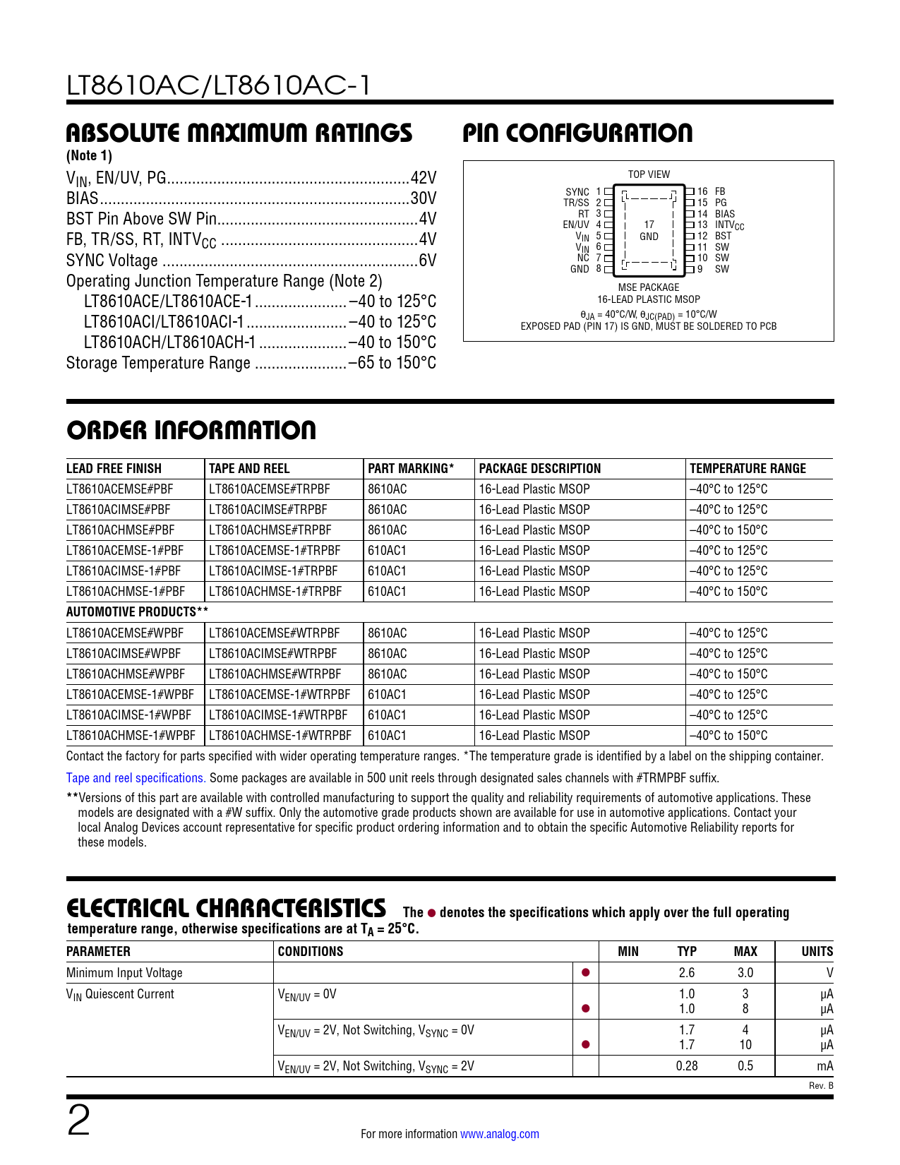LT8610AC/LT8610AC-1 ABSOLUTE MAXIMUM RATINGSPIN CONFIGURATION(Note 1) VIN, EN/UV, PG ..42V TOP VIEW BIAS ..30V SYNC 1 16 FB TR/SS 2 15 PG BST Pin Above SW Pin..4V RT 3 14 BIAS EN/UV 4 17 13 INTVCC FB, TR/SS, RT, INTVCC . ..4V V 5 IN GND 12 BST V 6 11 SW SYNC Voltage . ..6V IN NC 7 10 SW GND 8 9 SW Operating Junction Temperature Range (Note 2) MSE PACKAGE LT8610ACE/LT8610ACE-1 .. –40 to 125°C 16-LEAD PLASTIC MSOP LT8610ACI/LT8610ACI-1 .. –40 to 125°C θJA = 40°C/W, θJC(PAD) = 10°C/W EXPOSED PAD (PIN 17) IS GND, MUST BE SOLDERED TO PCB LT8610ACH/LT8610ACH-1 ...–40 to 150°C Storage Temperature Range ..–65 to 150°C ORDER INFORMATION LEAD FREE FINISHTAPE AND REELPART MARKING*PACKAGE DESCRIPTIONTEMPERATURE RANGE LT8610ACEMSE#PBF LT8610ACEMSE#TRPBF 8610AC 16-Lead Plastic MSOP –40°C to 125°C LT8610ACIMSE#PBF LT8610ACIMSE#TRPBF 8610AC 16-Lead Plastic MSOP –40°C to 125°C LT8610ACHMSE#PBF LT8610ACHMSE#TRPBF 8610AC 16-Lead Plastic MSOP –40°C to 150°C LT8610ACEMSE-1#PBF LT8610ACEMSE-1#TRPBF 610AC1 16-Lead Plastic MSOP –40°C to 125°C LT8610ACIMSE-1#PBF LT8610ACIMSE-1#TRPBF 610AC1 16-Lead Plastic MSOP –40°C to 125°C LT8610ACHMSE-1#PBF LT8610ACHMSE-1#TRPBF 610AC1 16-Lead Plastic MSOP –40°C to 150°C AUTOMOTIVE PRODUCTS** LT8610ACEMSE#WPBF LT8610ACEMSE#WTRPBF 8610AC 16-Lead Plastic MSOP –40°C to 125°C LT8610ACIMSE#WPBF LT8610ACIMSE#WTRPBF 8610AC 16-Lead Plastic MSOP –40°C to 125°C LT8610ACHMSE#WPBF LT8610ACHMSE#WTRPBF 8610AC 16-Lead Plastic MSOP –40°C to 150°C LT8610ACEMSE-1#WPBF LT8610ACEMSE-1#WTRPBF 610AC1 16-Lead Plastic MSOP –40°C to 125°C LT8610ACIMSE-1#WPBF LT8610ACIMSE-1#WTRPBF 610AC1 16-Lead Plastic MSOP –40°C to 125°C LT8610ACHMSE-1#WPBF LT8610ACHMSE-1#WTRPBF 610AC1 16-Lead Plastic MSOP –40°C to 150°C Contact the factory for parts specified with wider operating temperature ranges. *The temperature grade is identified by a label on the shipping container. Tape and reel specifications. Some packages are available in 500 unit reels through designated sales channels with #TRMPBF suffix. ** Versions of this part are available with controlled manufacturing to support the quality and reliability requirements of automotive applications. These models are designated with a #W suffix. Only the automotive grade products shown are available for use in automotive applications. Contact your local Analog Devices account representative for specific product ordering information and to obtain the specific Automotive Reliability reports for these models. ELECTRICALCHARACTERISTICS The l denotes the specifications which apply over the full operatingtemperature range, otherwise specifications are at TA = 25°C.PARAMETERCONDITIONSMINTYPMAXUNITS Minimum Input Voltage l 2.6 3.0 V VIN Quiescent Current VEN/UV = 0V 1.0 3 µA l 1.0 8 µA VEN/UV = 2V, Not Switching, VSYNC = 0V 1.7 4 µA l 1.7 10 µA VEN/UV = 2V, Not Switching, VSYNC = 2V 0.28 0.5 mA Rev. B 2 For more information www.analog.com Document Outline Features Applications Typical Application Description Absolute Maximum Ratings Order Information Electrical Characteristics Pin Configuration Typical Performance Characteristics Pin Functions Block Diagram Operation Applications Information Typical Applications Package Description Revision History Typical Application Related Parts