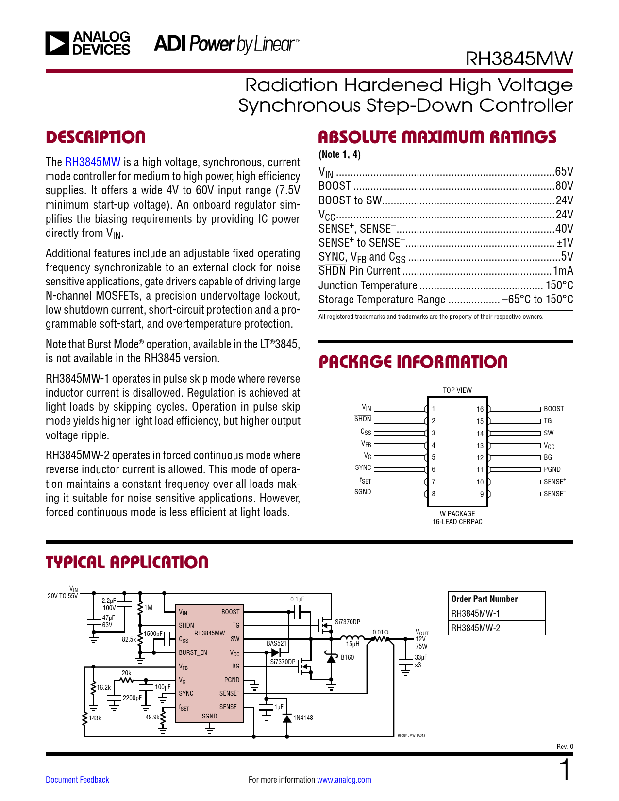 RH3845MW Radiation Hardened High Voltage Synchronous Step-Down Controller DESCRIPTIONABSOLUTE MAXIMUM RATINGS(Note 1, 4) The RH3845MW is a high voltage, synchronous, current mode controller for medium to high power, high efficiency VIN ..65V supplies. It offers a wide 4V to 60V input range (7.5V BOOST ..80V minimum start-up voltage). An onboard regulator sim- BOOST to SW..24V plifies the biasing requirements by providing IC power VCC ..24V directly from V SENSE+, SENSE– ...40V IN. SENSE+ to SENSE– .. ±1V Additional features include an adjustable fixed operating SYNC, V frequency synchronizable to an external clock for noise FB and CSS ...5V SHDN Pin Current ..1mA sensitive applications, gate drivers capable of driving large Junction Temperature ... 150°C N-channel MOSFETs, a precision undervoltage lockout, Storage Temperature Range ..–65°C to 150°C low shutdown current, short-circuit protection and a pro- grammable soft-start, and overtemperature protection. All registered trademarks and trademarks are the property of their respective owners. Note that Burst Mode® operation, available in the LT®3845, is not available in the RH3845 version. PACKAGE INFORMATION RH3845MW-1 operates in pulse skip mode where reverse inductor current is disallowed. Regulation is achieved at TOP VIEW light loads by skipping cycles. Operation in pulse skip VIN 1 16 BOOST mode yields higher light load efficiency, but higher output SHDN 2 15 TG voltage ripple. CSS 3 14 SW VFB 4 13 VCC RH3845MW-2 operates in forced continuous mode where VC 5 12 BG reverse inductor current is allowed. This mode of opera- SYNC 6 11 PGND tion maintains a constant frequency over all loads mak- fSET 7 10 SENSE+ ing it suitable for noise sensitive applications. However, SGND 8 9 SENSE– forced continuous mode is less efficient at light loads. W PACKAGE 16-LEAD CERPAC TYPICAL APPLICATION VIN 20V TO 55V 0.1µF 2.2µF Order Part Number 100V 1M VIN BOOST RH3845MW-1 47µF 63V SHDN TG Si7370DP RH3845MW-2 1500pF RH3845MW 0.01Ω VOUT 82.5k CSS SW 12V BAS521 15µH 75W BURST_EN VCC B160 33µF Si7370DP VFB BG ×3 20k VC PGND 16.2k 100pF SYNC SENSE+ 2200pF fSET SENSE– 1µF 143k 49.9k SGND 1N4148 RH3845MW TA01a Rev. 0 Document Feedback For more information www.analog.com 1 Document Outline Description Typical Application Absolute Maximum Ratings Package Information Table 1: Electrical characteristics Table 2: Electrical characteristics Electrical Characteristics: Burn-In Delta Parameters Electrical Test Requirements Total Dose Bias Circuit — Run Mode Total Dose Bias Circuit — Shutdown Mode Burn-In Circuit—Run Mode Package Description Typical Performance Characteristics