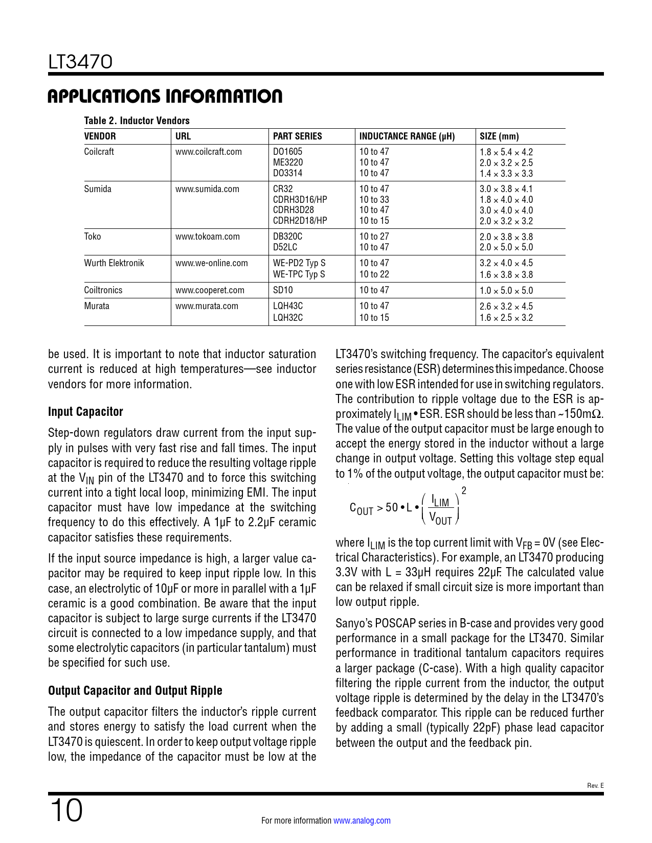 APPLICATIONS INFORMATION. Table 2. Inductor Vendors VENDOR. URL. PART SERIES. INDUCTANCE RANGE (µH). SIZE (mm). Input Capacitor