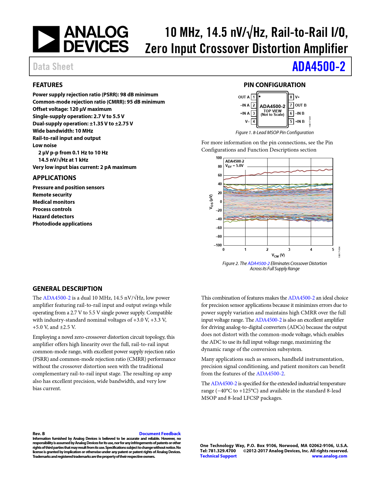 10 MHz, 14.5 nV/√Hz, Rail-to-Rail I/O,. Zero Input Crossover Distortion Amplifier. Data Sheet. ADA4500-2. FEATURES