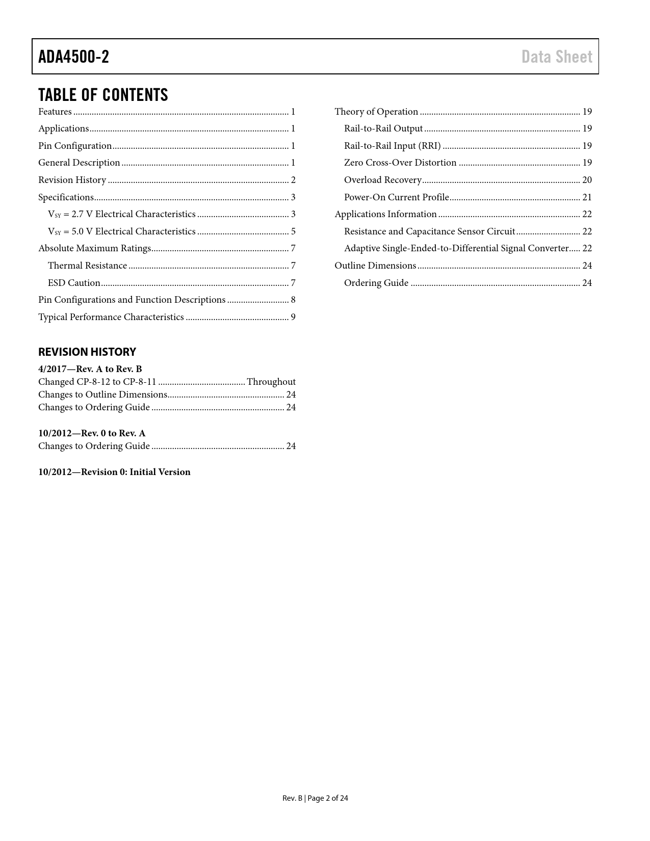ADA4500-2 Data Sheet TABLE OF CONTENTS REVISION HISTORY 4/2017—Rev A to Rev B 10/2012—Rev 0 to Rev A