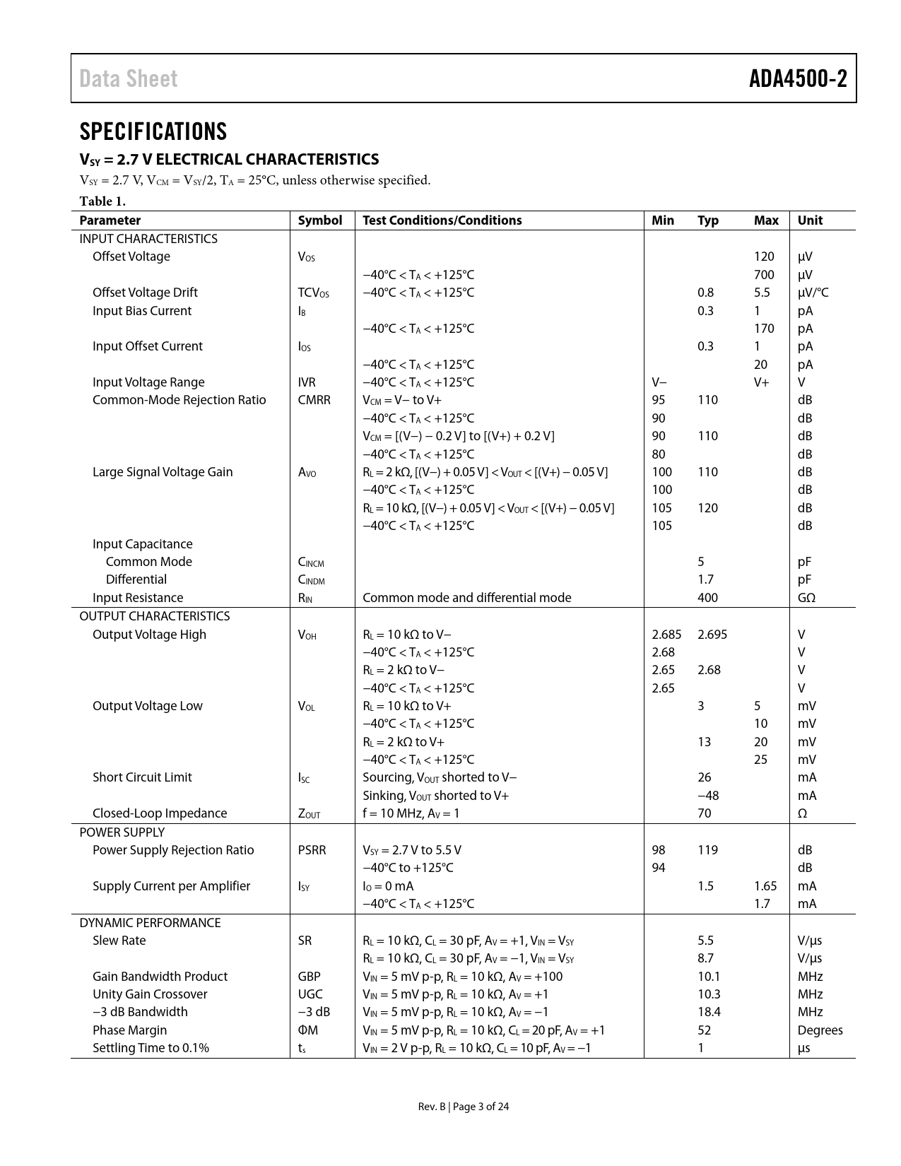 Data Sheet. ADA4500-2. SPECIFICATIONS VSY = 2.7 V ELECTRICAL CHARACTERISTICS. Table 1. Parameter Symbol. Test