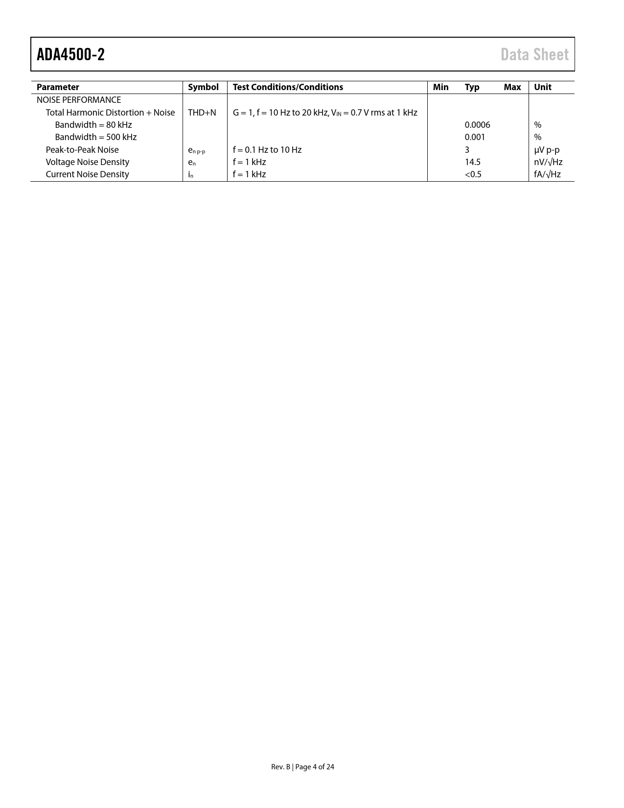 Seiten / Seite24 / 4 — ADA4500-2. Data Sheet. Parameter Symbol. Test. Conditions/Conditions. …