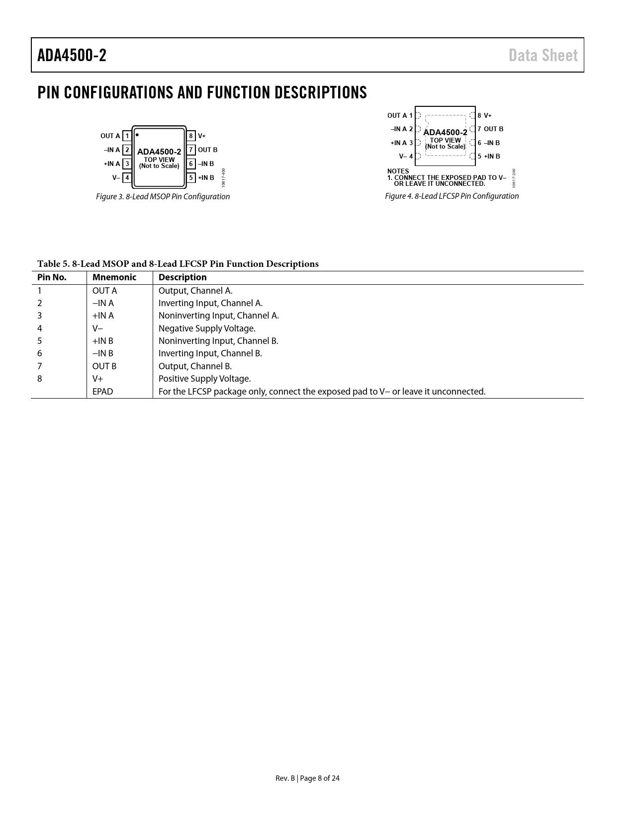 ADA4500-2Data SheetPIN CONFIGURATIONS AND FUNCTION DESCRIPTIONSOUT A 18 V+–IN A 27 OUT BADA4500-2OUT A 18 V++IN A 3TOP VIEW6 –IN B–IN A 27 OUT B(Not to Scale)ADA4500-25 +IN BTOP VIEWV– 4+IN A 36 –IN B(Not to Scale) 0 NOTES 40 00 2 V– 45 +IN B 7- 1. CONNECT THE EXPOSED PAD TO V– 7- 61 OR LEAVE IT UNCONNECTED. 10 061 1 Figure 3. 8-Lead MSOP Pin Configuration Figure 4. 8-Lead LFCSP Pin Configuration Table 5. 8-Lead MSOP and 8-Lead LFCSP Pin Function Descriptions Pin No.MnemonicDescription 1 OUT A Output, Channel A. 2 −IN A Inverting Input, Channel A. 3 +IN A Noninverting Input, Channel A. 4 V− Negative Supply Voltage. 5 +IN B Noninverting Input, Channel B. 6 −IN B Inverting Input, Channel B. 7 OUT B Output, Channel B. 8 V+ Positive Supply Voltage. EPAD For the LFCSP package only, connect the exposed pad to V− or leave it unconnected. Rev. B | Page 8 of 24 Document Outline FEATURES APPLICATIONS PIN CONFIGURATION GENERAL DESCRIPTION TABLE OF CONTENTS REVISION HISTORY SPECIFICATIONS VSY = 2.7 V ELECTRICAL CHARACTERISTICS VSY = 5.0 V ELECTRICAL CHARACTERISTICS ABSOLUTE MAXIMUM RATINGS THERMAL RESISTANCE ESD CAUTION PIN CONFIGURATIONS AND FUNCTION DESCRIPTIONS TYPICAL PERFORMANCE CHARACTERISTICS THEORY OF OPERATION RAIL-TO-RAIL OUTPUT RAIL-TO-RAIL INPUT (RRI) ZERO CROSS-OVER DISTORTION OVERLOAD RECOVERY POWER-ON CURRENT PROFILE APPLICATIONS INFORMATION RESISTANCE AND CAPACITANCE SENSOR CIRCUIT ADAPTIVE SINGLE-ENDED-TO-DIFFERENTIAL SIGNAL CONVERTER The Challenge The Solution OUTLINE DIMENSIONS ORDERING GUIDE